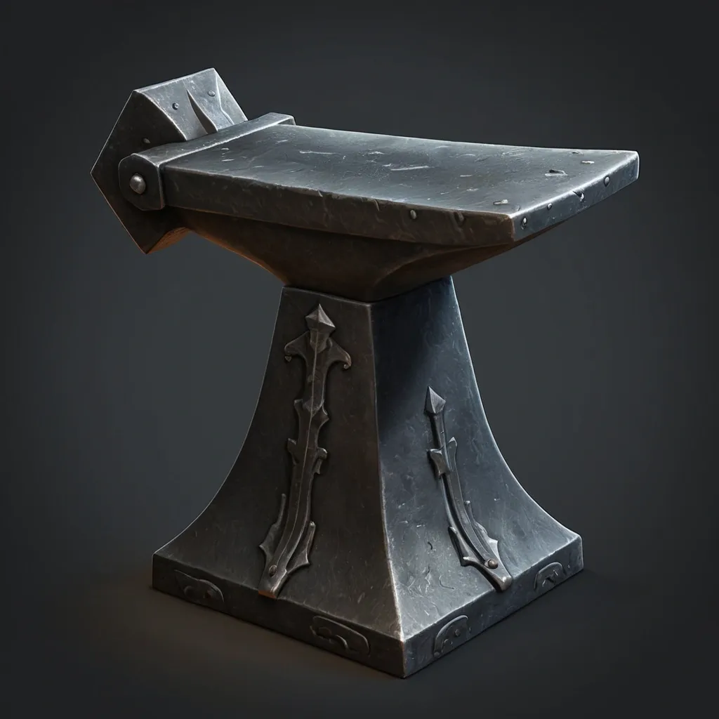 Medieval blacksmith anvil , dark grey iron metal , hand-painted game asset style. Classic anvil shape: flat top face , pointed horn on one end , square heel on other end , thick waist , four feet. Raised beveled edges , subtle metallic sheen , soft highlights on top and edges , shadows in recesses. Brushed forged metal texture , slight wear. Front or three-quarter view , isolated on transparent background , stylized fantasy , lighting from top-left ,