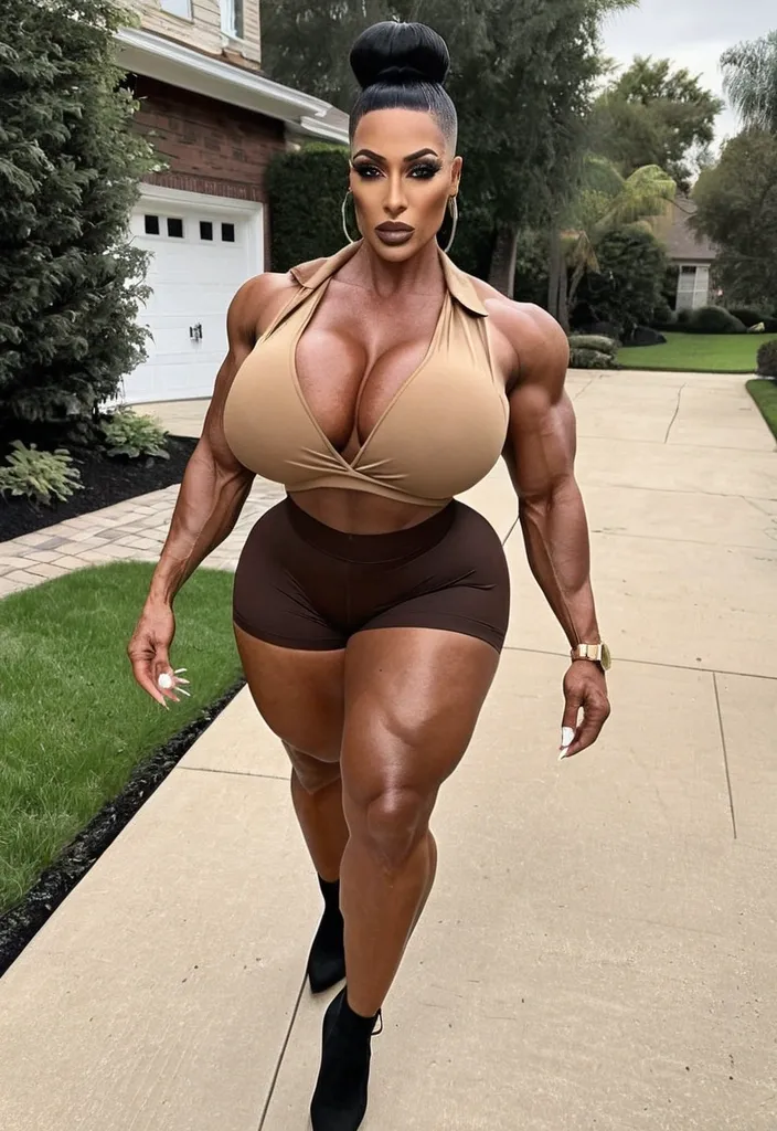 Generate Gorgeous female boss , bimbo , 42 years old , African-American woman , , , hourglass body , abnormally massive female bodybuilder , gorgeous , close up , full lips , big booty , buzz cut , black hair , hair bun , feminine silhouette , too big breast , big booty , sexy thighs abs , silhouette , up close , flexing biceps , gorgeous brown eyes , legs are iconic and defining physical feature , both visually and in terms of combat ability.wearing an outfit that is a striking blend of elegance , power , and femininity , designed to command attention in any room. The suit is tailored to perfection , hugging the wearer’s curves with precision while emphasizing a structured silhouette. The fabric itself is a refined grey tweed patterned with subtle white grid lines , giving the suit a texture that feels both sophisticated and modern. The blazer features broad blue lapels and gold button accents , adding a luxurious touch that elevates the look beyond typical business attire. The matching high-waisted trousers elongate the frame , further enhancing the poised and commanding effect of the ensemble.The styling choices amplify the boldness of the suit. The inner blouse is a silky , greybutton-down shirt that complements the tweed’s tone while introducing a softer , feminine balance to the sharp tailoring of the jacket. The blouse peeks out neatly from under the blazer , maintaining elegance without drawing focus away from the suit’s commanding cut. Accessories are kept minimal yet intentional: a delicate layered gold necklace and hoop earrings that add glimmers of light and luxury without overpowering the outfit. The choice of voluminous , honey-brown braids cascading down her shoulders frames the face with both confidence and glamour , completing the commanding visual.Altogether , this look communicates a blend of authority and allure. It is business-ready yet fashion-forward , balancing corporate structure with vibrant femininity. The color palette blue , grey and gold avoids being overly delicate , instead embracing the richness of texture , structure , and presence. This is the kind of ensemble that speaks to ambition , sophistication , and personal style—ideal for someone who thrives in positions of influence but insists on expressing her individuality with bold elegance. It’s not just clothing—it’s a statement of power wrapped in grace. In luxury living legs that could crush a watermelon , skirt high boots are a bold and striking statement piece , crafted in glossy black patent leather that gives them a sleek , polished finish. Rising to just below the knee , the boots feature three adjustable buckle straps along the shaft , adding both edge and detail to their design. The towering stiletto heel , paired with a thick platform sole , creates an ultra-dramatic silhouette that elongates the leg and exudes power and confidence. With their combination of shine , height , and structure , these boots perfectly balance fierce femininity with high-fashion allure. High cheekbones , prominent jawline , gorgeous big brown eyes , , enormous breast , wearing brown collard shirt , brown fit-it cap , brown shorts , walking on drive way carring bending over working on plants in yard ,