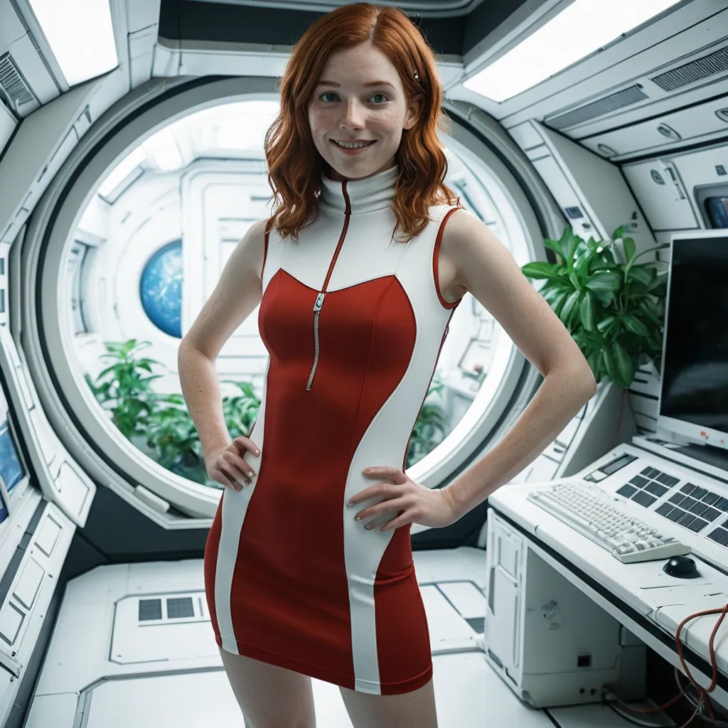 full lenght , a beautiful european freckled female with wavy auburn shoulder hair in her mid twenty in red and white turtleneck sleeveless zipper spandex MINI spacedress , gentle smile a hand on hip she's standing lovely in front of a window in a futuristic space station with japanese influence , some computer and screen and a green plant , bed in the room , science fiction cinematic style ,