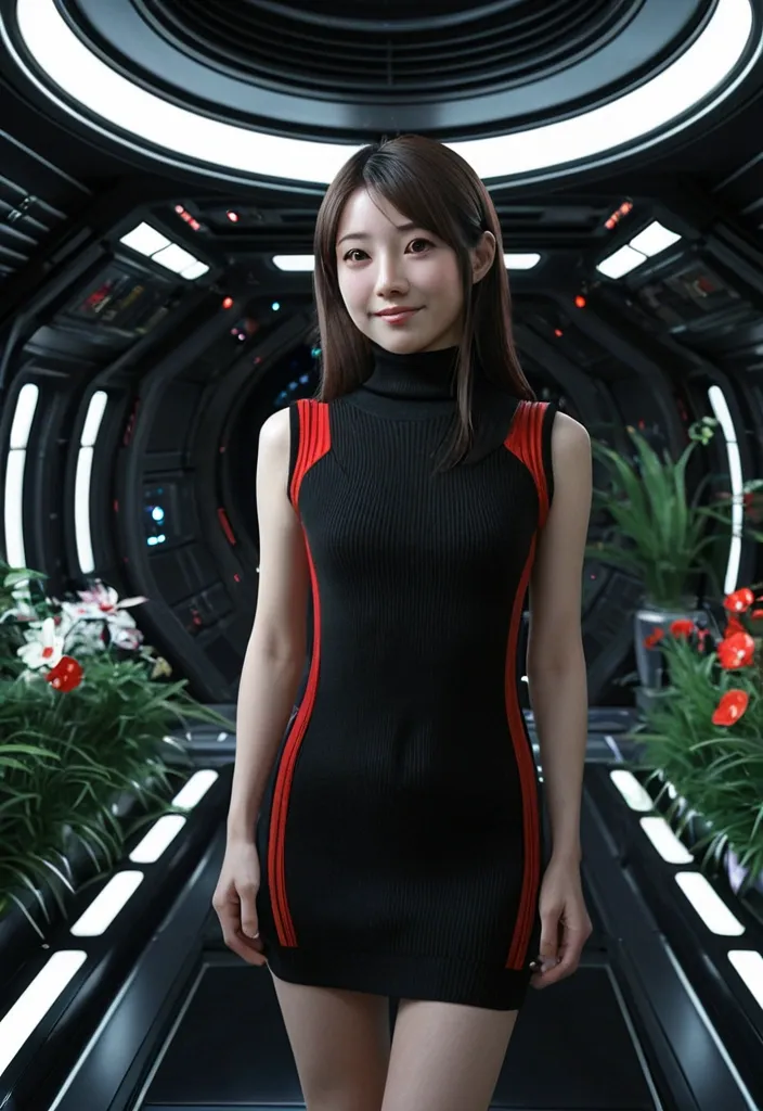 masterpiece photorealistic full lenght a beautiful japanese female with straight shoulder brown hair in her mid twenties in black and red turtleneck sleeveless zipper spandex mini sweaterdress , gentle smile a hand on her hip , standing in a futuristic luminous space station with japanese influence , some flowers and green plants , a bed in the room , science fiction cinematic style ,
