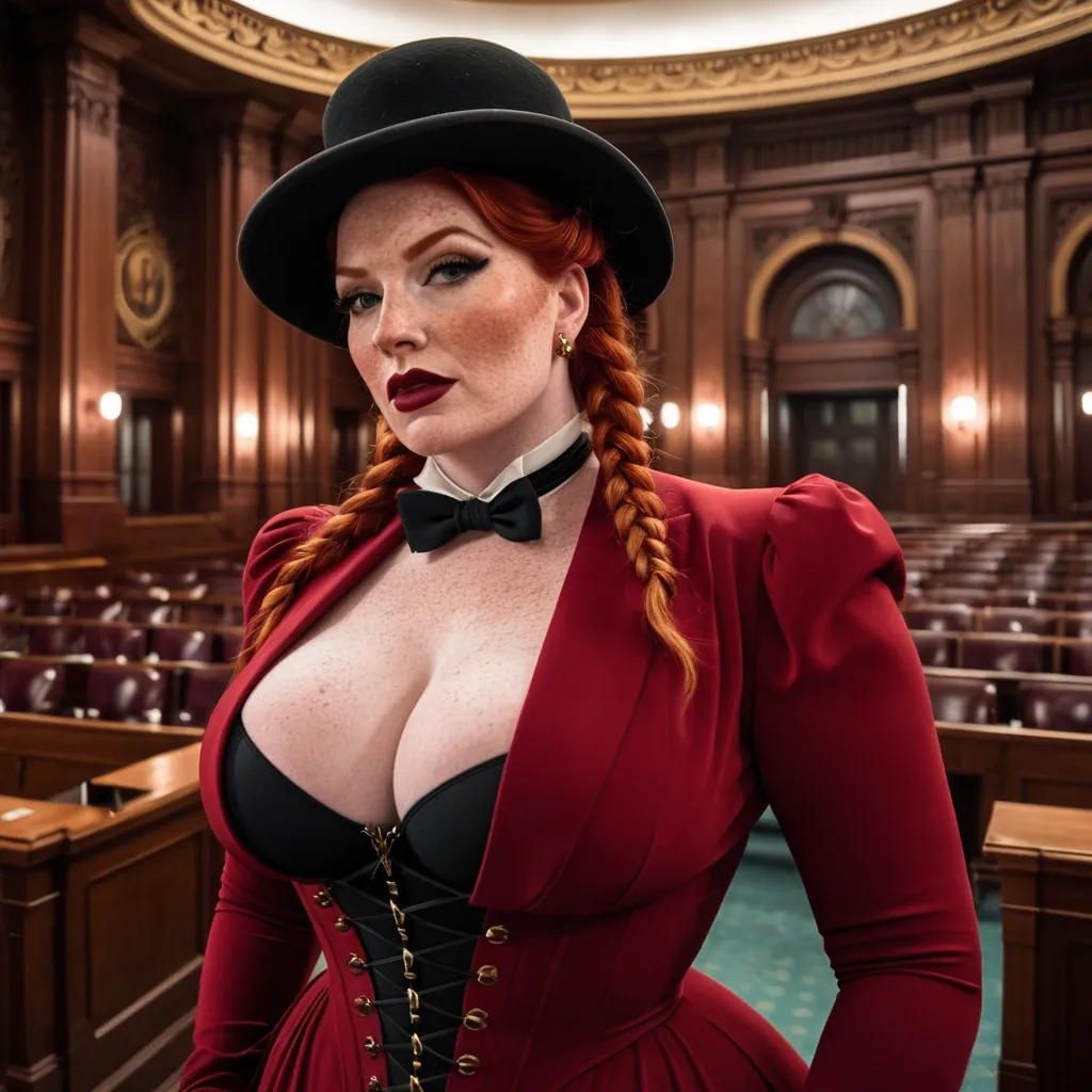full lips , big booty , redheaded , freckles on face and breast , freckles on breasr , 1940s Hollywood Victorian braided hair , feminine silhouette , too big breast , big booty , sexy thighs abs , silhouette , up close , flexing biceps , beautiful green eyes , legs are iconic and defining physical feature , both visually and in terms of combat ability.wearing an outfit that is a striking blend of elegance , power , and femininity , designed to command attention in any room. The suit is tailored to perfection , hugging the wearer’s curves with precision while emphasizing a structured silhouette. The fabric itself is a refined grey tweed patterned with subtle white grid lines , giving the suit a texture that feels both sophisticated and modern. The blazer features broad blue lapels and gold button accents , adding a luxurious touch that elevates the look beyond typical business attire. The matching high-waisted trousers elongate the frame , further enhancing the poised and commanding effect of the ensemble.The styling choices amplify the boldness of the suit. The inner blouse is a silky , greybutton-down shirt that complements the tweed’s tone while introducing a softer , feminine balance to the sharp tailoring of the jacket. The blouse peeks out neatly from under the blazer , maintaining elegance without drawing focus away from the suit’s commanding cut. Accessories are kept minimal yet intentional: a delicate layered gold necklace and hoop earrings that add glimmers of light and luxury without overpowering the outfit. The choice of voluminous , honey-brown braids cascading down her shoulders frames the face with both confidence and glamour , completing the commanding visual.Altogether , this look communicates a blend of authority and allure. It is business-ready yet fashion-forward , balancing corporate structure with vibrant femininity. The color palette blue , grey and gold avoids being overly delicate , instead embracing the richness of texture , structure , and presence. This is the kind of ensemble that speaks to ambition , sophistication , and personal style—ideal for someone who thrives in positions of influence but insists on expressing her individuality with bold elegance. It’s not just clothing—it’s a statement of power wrapped in grace. In luxury living legs that could crush a watermelon , skirt , Enormous breast , enormous butt , mass cleavage , enormous butt , full body shot , enormous breast , stacked hourglass body , top hat , a feminine Victorian jacket , Victorian pants , feminine top hat , enormous breast , enormous butt , standing in a art-deco courtroom , burgundy blazer , dress , corset , massive cleavage , facing viewer , up close ,