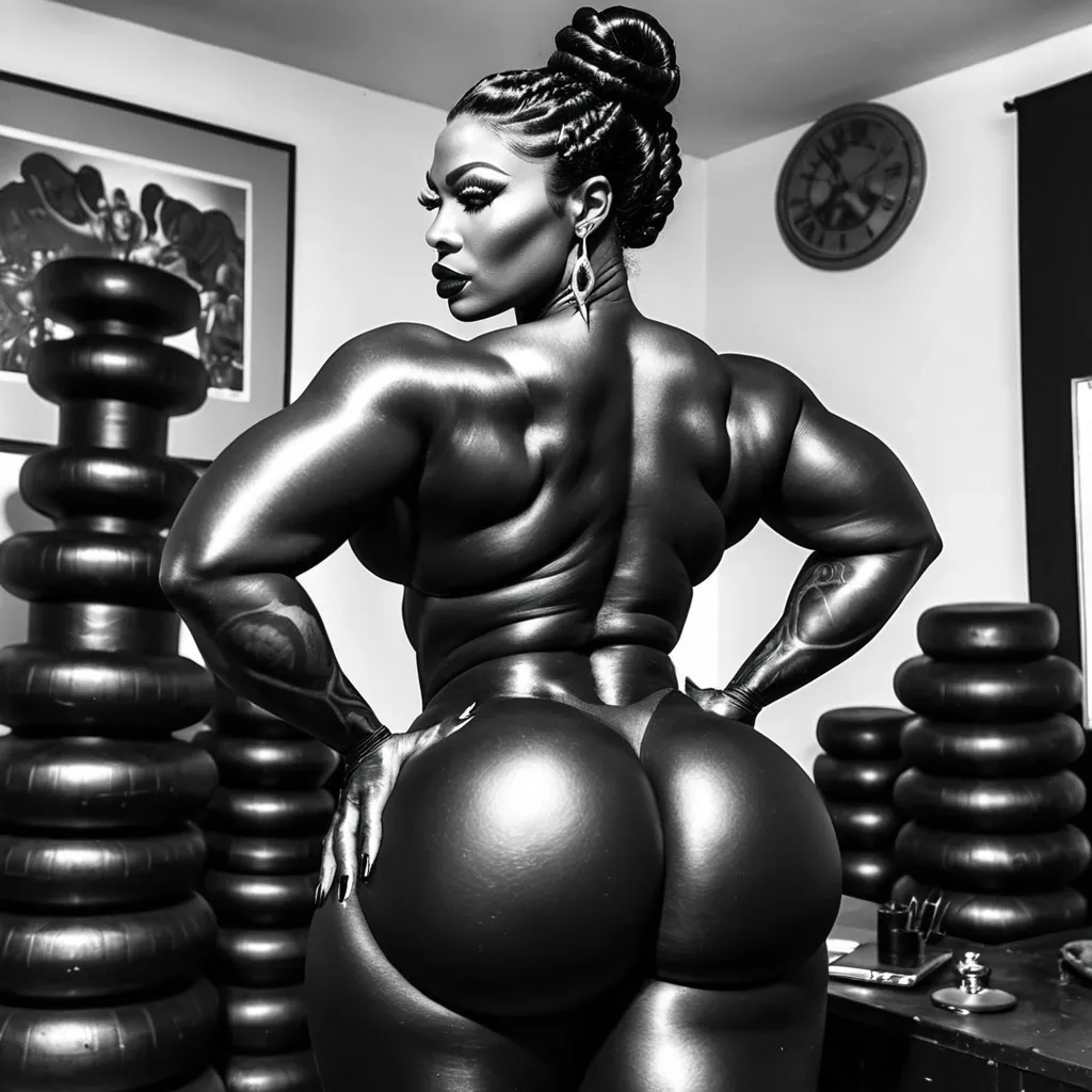 Generate Gorgeous female 1940s queen , bimbo , hourglass body , abnormally massive female bodybuilder , gorgeous , close up , full lips , big booty , black , braided design updo hair , feminine silhouette , too big breast , big booty , sexy thighs abs , silhouette , up close , flexing biceps , beautiful brown eyes , legs are iconic and defining physical feature , both visually and in terms of combat ability.wearing an outfit that is a striking blend of elegance , power , and femininity , designed to command attention in any room. The suit is tailored to perfection , hugging the wearer’s curves with precision while emphasizing a structured silhouette. The fabric itself is a refined grey tweed patterned with subtle white grid lines , giving the suit a texture that feels both sophisticated and modern. The blazer features broad blue lapels and gold button accents , adding a luxurious touch that elevates the look beyond typical business attire. The matching high-waisted trousers elongate the frame , further enhancing the poised and commanding effect of the ensemble.The styling choices amplify the boldness of the suit. The inner blouse is a silky , greybutton-down shirt that complements the tweed’s tone while introducing a softer , feminine balance to the sharp tailoring of the jacket. The blouse peeks out neatly from under the blazer , maintaining elegance without drawing focus away from the suit’s commanding cut. Accessories are kept minimal yet intentional: a delicate layered gold necklace and hoop earrings that add glimmers of light and luxury without overpowering the outfit. The choice of voluminous , honey-brown braids cascading down her shoulders frames the face with both confidence and glamour , completing the commanding visual.Altogether , this look communicates a blend of authority and allure. It is business-ready yet fashion-forward , balancing corporate structure with vibrant femininity. The color palette pearl white , silver and gold avoids being overly delicate , instead embracing the richness of texture , structure , and presence. This is the kind of ensemble that speaks to ambition , sophistication , and personal style—ideal for someone who thrives in positions of influence but insists on expressing her individuality with bold elegance. It’s not just clothing—it’s a statement of power wrapped in grace. In luxury living legs that could crush a watermelon , golden eagle emblem om his chest , , cape , bodysuit , high boots , stacked hourglass feminine silhouette , full body shot , enormous breast , enormous butt , powerful feminine silhouette , enormous breastm enormous butt , abs , stacked ,