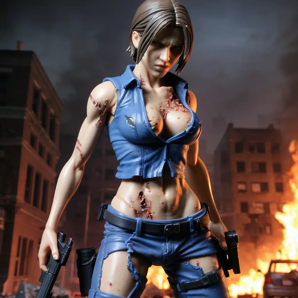 Resident Evil 6 , Sherry Birkin as an action figure on a diorama.Description Character Name: Sherry BirkinAge/Appearance: An adult woman , 26 (appearing in her late teens/early 20s due to the G-virus remnants) , 5' 5" (165 cm) tall.Physical Features: Short , blonde , bob-cut hair (shorter than her RE2 appearance) , and blue eyes. Hospital Gown and Attire Details Garment: A white patient/hospital gown. It is a simple , standard-issue test subject uniform.Style: It appears to be a back-tie or wrap-around style gown , somewhat loose-fitting , designed for a lab/medical setting rather than a fashionable piece of clothing. It is noted for being one of her less conservative outfits in the game , in contrast to her main campaign clothes.Color/Material: Plain white , likely a light , inexpensive fabric like cotton or a synthetic blend typical of institutional wear.Additional elements: She has no shoes or socks in this specific lab setting. There are no additional accessories , weapons , or gear. She may have some dirt/wounds or appear sweaty/wet depending on the specific moment being The scene is a sterile , dimly lit laboratory or containment area within a Neo-Umbrella facility in Lanshiang , China. This context can help the AI set the "A 3D render of Sherry Birkin from the video game Resident Evil 6 , an adult woman with short blonde bob-cut hair and blue eyes , wearing a plain white , back-tie hospital gown that is slightly loose-fitting. She is standing in a sterile , dimly lit laboratory. The image should capture her determined expression while looking vulnerable. Full body shot , realistic , high detail , video game character art , Capcom style , horror game atmosphere." ,