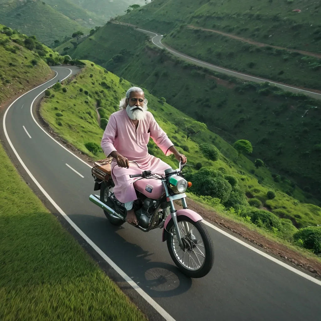 Epic aerial drone shot of a rider (realistic photo using the provided input image as identity reference). mature Indian man , body proportions , and long curly white mustache , wearing a Rajasthani traditional light-pink kurta , white dhoti , dark brown leather Jutti and accessorized with delicate framed glasses (same or very similar styling to input image)). cruising through a winding Pavagadh's mountain road , vehicle adjusted to match the reference photo provided later. The drone starts high above , revealing a dramatic serpentine road cutting through lush green hills and rocky velly. Camera slowly descends and tracks the rider from front-side and slightly above , capturing smooth S-curves as the rider leans into each turn. Occasional wide shots emphasize the scale of the landscape , with another rider visible in the distance. Natural daylight , soft shadows , vibrant greens , cinematic color grading. Subtle motion blur , smooth stabilized drone movement , gentle orbit and follow transitions. Ultra-realistic , high detail , immersive atmosphere. ,