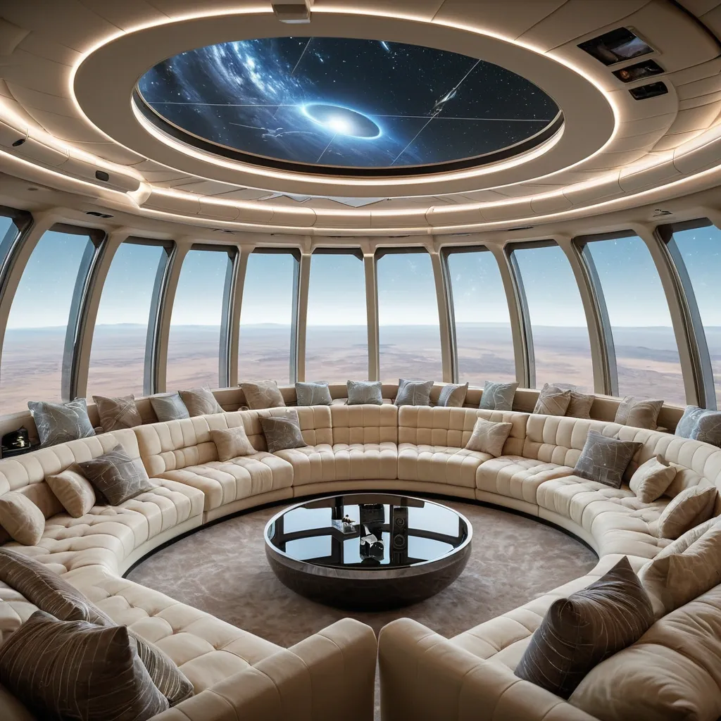 This luxurious living room on a space ship boasts a panoramic window that wraps around one entire wall , offering a stunning view of the earth and the stars beyond. The furniture is plush and inviting , with plush sofas and armchairs upholstered in soft , cream-colored fabric. A large , rectangular coffee table made of clear glass sits at the center of the room , and a few decorative pillows add pops of color. A few high-tech gadgets , such as a holographic display and a floating shelf , add a futuristic touch ,