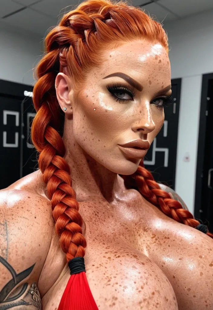Generate Gorgeous female boss , bimbo , hourglass body , abnormally massive female bodybuilder , gorgeous , close up , full lips , big booty , redheaded , freckles on face and breast , braided design hair , feminine silhouette , too big breast , big booty , sexy thighs abs , silhouette , up close , flexing biceps , beautiful green eyes , legs are iconic and defining physical feature , both visually and in terms of combat ability.wearing an outfit that is a striking blend of elegance , power , and femininity , designed to command attention in any room. The suit is tailored to perfection , hugging the wearer’s curves with precision while emphasizing a structured silhouette. The fabric itself is a refined grey tweed patterned with subtle white grid lines , giving the suit a texture that feels both sophisticated and modern. The blazer features broad blue lapels and gold button accents , adding a luxurious touch that elevates the look beyond typical business attire. The matching high-waisted trousers elongate the frame , further enhancing the poised and commanding effect of the ensemble.The styling choices amplify the boldness of the suit. The inner blouse is a silky , greybutton-down shirt that complements the tweed’s tone while introducing a softer , feminine balance to the sharp tailoring of the jacket. The blouse peeks out neatly from under the blazer , maintaining elegance without drawing focus away from the suit’s commanding cut. Accessories are kept minimal yet intentional: a delicate layered gold necklace and hoop earrings that add glimmers of light and luxury without overpowering the outfit. The choice of voluminous , honey-brown braids cascading down her shoulders frames the face with both confidence and glamour , completing the commanding visual.Altogether , this look communicates a blend of authority and allure. It is business-ready yet fashion-forward , balancing corporate structure with vibrant femininity. The color palette blue , grey and gold avoids being overly delicate , instead embracing the richness of texture , structure , and presence. This is the kind of ensemble that speaks to ambition , sophistication , and personal style—ideal for someone who thrives in positions of influence but insists on expressing her individuality with bold elegance. It’s not just clothing—it’s a statement of power wrapped in grace. Stacked hourglass silhouette ,