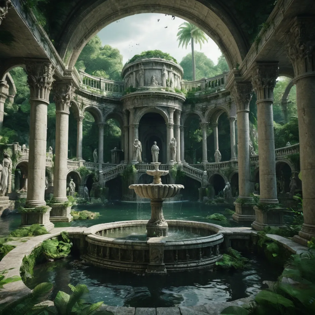 A diver in a futuristic suit explores a sunken city in the depths of the ocean. Gigantic buildings covered in coral and algae emerge from the darkness. Bioluminescent sea creatures swim around , illuminating the scene with green and blue flashes. As he moves forward with his flashlight , he discovers an ancient statue from a lost civilization. Suddenly , a huge leviathan with glowing eyes appears in the distance , silently watching him. ,