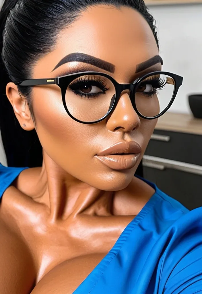 Generate Gorgeous female nurse , bimbo , hourglass body , golden brown skin complexion. abnormally massive female bodybuilder , gorgeous , close up , full lips , big booty , black hair , eye glasses , Philippine woman , black pompadour stylish hair , feminine silhouette , too big breast , big booty , sexy thighs abs , silhouette , up close , flexing biceps , beautiful green eyes , legs are iconic and defining physical feature , both visually and in terms of combat ability.wearing an outfit that is a striking blend of elegance , power , and femininity , designed to command attention in any room. The suit is tailored to perfection , hugging the wearer’s curves with precision while emphasizing a structured silhouette. The fabric itself is a refined grey tweed patterned with subtle white grid lines , giving the suit a texture that feels both sophisticated and modern. The blazer features broad blue lapels and gold button accents , adding a luxurious touch that elevates the look beyond typical business attire. The matching high-waisted trousers elongate the frame , further enhancing the poised and commanding effect of the ensemble.The styling choices amplify the boldness of the suit. The inner blouse is a silky , greybutton-down shirt that complements the tweed’s tone while introducing a softer , feminine balance to the sharp tailoring of the jacket. The blouse peeks out neatly from under the blazer , maintaining elegance without drawing focus away from the suit’s commanding cut. Accessories are kept minimal yet intentional: a delicate layered gold necklace and hoop earrings that add glimmers of light and luxury without overpowering the outfit. The choice of voluminous , honey-brown braids cascading down her shoulders frames the face with both confidence and glamour , completing the commanding visual.Altogether , this look communicates a blend of authority and allure. It is business-ready yet fashion-forward , balancing corporate structure with vibrant femininity. The color palette blue , grey and gold avoids being overly delicate , instead embracing the richness of texture , structure , and presence. This is the kind of ensemble that speaks to ambition , sophistication , and personal style—ideal for someone who thrives in positions of influence but insists on expressing her individuality with bold elegance. It’s not just clothing—it’s a statement of power wrapped in grace. In luxury living legs that could crush a watermelon , skirt high boots are a bold and striking statement piece , crafted in glossy black patent leather that gives them a sleek , polished finish. Rising to just below the knee , the boots feature three adjustable buckle straps along the shaft , adding both edge and detail to their design. The towering stiletto heel , paired with a thick platform sole , creates an ultra-dramatic silhouette that elongates the leg and exudes power and confidence. With their combination of shine , height , and structure , these boots perfectly balance fierce femininity with high-fashion allure. High cheekbones , prominent jawline , gorgeous big brown eyes , powerful curves , enormous breast , sitting in blue scrubs , voluptuous , up close shot , ,