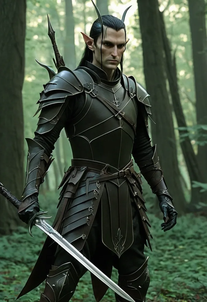 Elf Against the backdrop of a morning leafy forest General: Tall , graceful , with sharp features and long ears. Armor is light and aerodynamic. Armor: Practical dark leather , without unnecessary details. Multiple weapon straps. Weapons: Dagger and short sword—blades with a broken silhouette , ideal for quick slashing strikes. Handles are wrapped for a better grip. ,