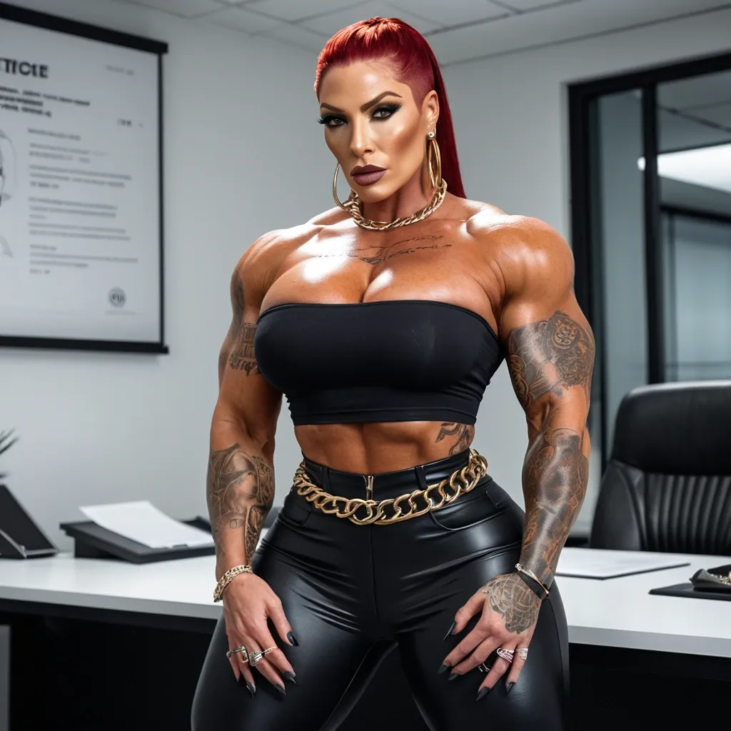 Generate Gorgeous female boss , bimbo , hourglass body , abnormally massive female bodybuilder , gorgeous , close up , full lips , big booty , redheaded , freckles on face and breast , shaved hair , feminine silhouette , too big breast , big booty , sexy thighs abs , silhouette , up close , flexing biceps , beautiful green eyes , legs are iconic and defining physical feature , both visually and in terms of combat ability.wearing an outfit that is a striking blend of elegance , power , and femininity , designed to command attention in any room. The suit is tailored to perfection , hugging the wearer’s curves with precision while emphasizing a structured silhouette. The fabric itself is a refined grey tweed patterned with subtle white grid lines , giving the suit a texture that feels both sophisticated and modern. The blazer features broad blue lapels and gold button accents , adding a luxurious touch that elevates the look beyond typical business attire. The matching high-waisted trousers elongate the frame , further enhancing the poised and commanding effect of the ensemble.The styling choices amplify the boldness of the suit. The inner blouse is a silky , greybutton-down shirt that complements the tweed’s tone while introducing a softer , feminine balance to the sharp tailoring of the jacket. The blouse peeks out neatly from under the blazer , maintaining elegance without drawing focus away from the suit’s commanding cut. Accessories are kept minimal yet intentional: a delicate layered gold necklace and hoop earrings that add glimmers of light and luxury without overpowering the outfit. The choice of voluminous , honey-brown braids cascading down her shoulders frames the face with both confidence and glamour , completing the commanding visual.Altogether , this look communicates a blend of authority and allure. It is business-ready yet fashion-forward , balancing corporate structure with vibrant femininity. The color palette blue , grey and gold avoids being overly delicate , instead embracing the richness of texture , structure , and presence. This is the kind of ensemble that speaks to ambition , sophistication , and personal style—ideal for someone who thrives in positions of influence but insists on expressing her individuality with bold elegance. It’s not just clothing—it’s a statement of power wrapped in grace. In luxury living legs that could crush a watermelon , skirt high boots are a bold and striking statement piece , crafted in glossy black patent leather that gives them a sleek , polished finish. Rising to just below the knee , the boots feature three adjustable buckle straps along the shaft , adding both edge and detail to their design. The towering stiletto heel , paired with a thick platform sole , creates an ultra-dramatic silhouette that elongates the leg and exudes power and confidence. With their combination of shine , height , and structure , these boots perfectly balance fierce femininity with high-fashion allure , outfit features a cropped black off-the-shoulder top with the bold white lettering “MO DID IT , ” emphasizing a confident , modern edge. She pairs it with high-waisted , distressed blue jeans that highlight her curvy silhouette , blending casual streetwear with bold self-expression. Gold jewelry — layered chains , hoop earrings , and bracelets — along with her detailed tattoos and platinum blonde buzz cut , complete the fierce , empowered aesthetic. in barbershop , freckles , ginger hair , ,