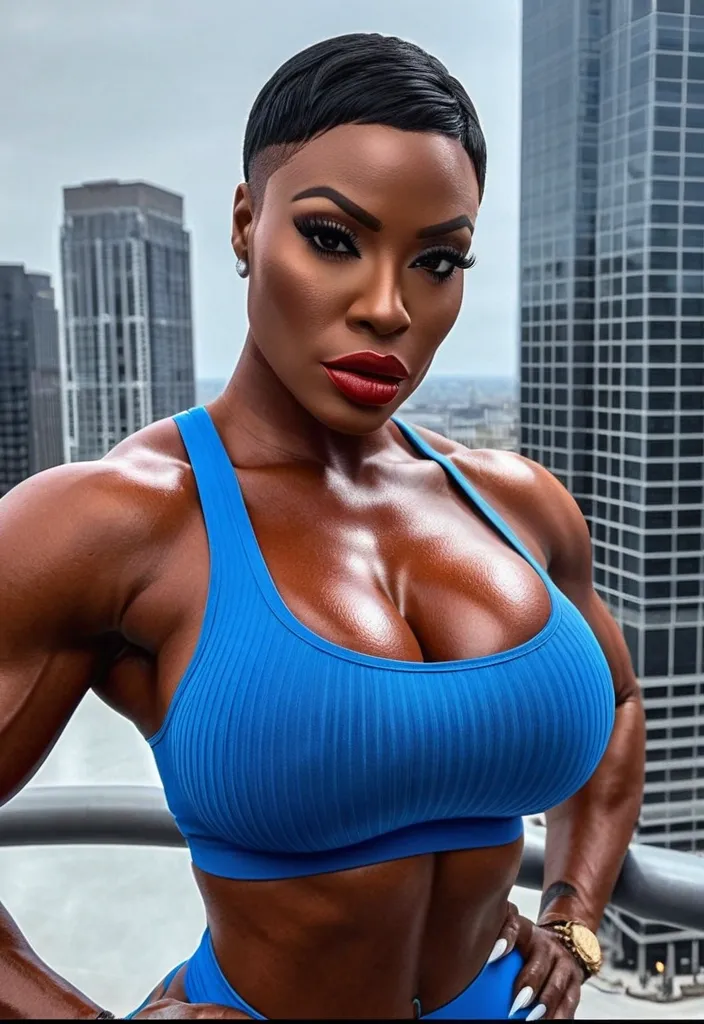 Generate Gorgeous female boss , dark-skinned African-American woman , Her hair is a short , velvety , tightly-cropped crimson cut that frames her face like a crown of fire.big lips , bimbo , hourglass body , abnormally massive female bodybuilder , gorgeous , close up , full lips , big booty , feminine silhouette , too big breast , big booty , sexy thighs abs , silhouette , up close , flexing biceps , beautiful brown eyes , legs are iconic and defining physical feature , both visually and in terms of combat ability.wearing an outfit that is a striking blend of elegance , power , and femininity , designed to command attention in any room. The suit is tailored to perfection , hugging the wearer’s curves with precision while emphasizing a structured silhouette. The fabric itself is a refined grey tweed patterned with subtle white grid lines , giving the suit a texture that feels both sophisticated and modern. The blazer features broad blue lapels and gold button accents , adding a luxurious touch that elevates the look beyond typical business attire. The matching high-waisted trousers elongate the frame , further enhancing the poised and commanding effect of the ensemble.The styling choices amplify the boldness of the suit. The inner blouse is a silky , greybutton-down shirt that complements the tweed’s tone while introducing a softer , feminine balance to the sharp tailoring of the jacket. The blouse peeks out neatly from under the blazer , maintaining elegance without drawing focus away from the suit’s commanding cut. Accessories are kept minimal yet intentional: a delicate layered gold necklace and hoop earrings that add glimmers of light and luxury without overpowering the outfit. The choice of voluminous , honey-brown braids cascading down her shoulders frames the face with both confidence and glamour , completing the commanding visual.Altogether , this look communicates a blend of authority and allure. It is business-ready yet fashion-forward , balancing corporate structure with vibrant femininity. The color palette blue , grey and gold avoids being overly delicate , instead embracing the richness of texture , structure , and presence. This is the kind of ensemble that speaks to ambition , sophistication , and personal style—ideal for someone who thrives in positions of influence but insists on expressing her individuality with bold elegance. It’s not just clothing—it’s a statement of power wrapped in grace. In luxury living legs that could crush a watermelon , skirt high boots are a bold and striking statement piece , crafted in glossy black patent leather that gives them a sleek , polished finish. Rising to just below the knee , the boots feature three adjustable buckle straps along the shaft , adding both edge and detail to their design. The towering stiletto heel , paired with a thick platform sole , creates an ultra-dramatic silhouette that elongates the leg and exudes power and confidence. With their combination of shine , height , and structure , these boots perfectly balance fierce femininity with high-fashion allure. High cheekbones , prominent jawline , gorgeous big brown eyes , enormous breast , blue tank top , high rise grey short , enormous breast , enormous butt ,