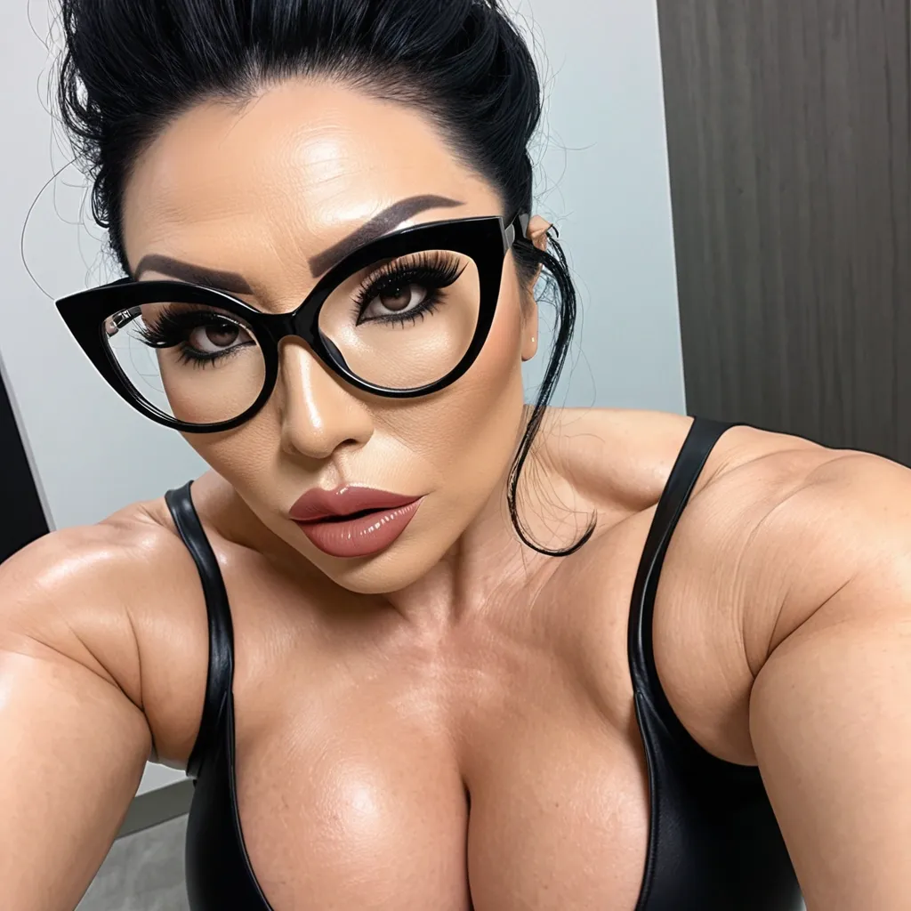 Japanese woman , Generate Gorgeous female boss , bimbo , hourglass body , 42 years old , eyeliner , lip gloss , abnormally massive female bodybuilder , gorgeous , close up , full lips , big booty , black hair , pompadour design hair , feminine silhouette , too big breast , big booty , sexy thighs abs , silhouette , up close , flexing biceps , beautiful alluring brown eyes , legs are iconic and defining physical feature , both visually and in terms of combat ability.wearing an outfit that is a striking blend of elegance , power , and femininity , designed to command attention in any room. The suit is tailored to perfection , hugging the wearer’s curves with precision while emphasizing a structured silhouette. The fabric itself is a refined grey tweed patterned with subtle white grid lines , giving the suit a texture that feels both sophisticated and modern. The blazer features broad blue lapels and gold button accents , adding a luxurious touch that elevates the look beyond typical business attire. The matching high-waisted trousers elongate the frame , further enhancing the poised and commanding effect of the ensemble.The styling choices amplify the boldness of the suit. The inner blouse is a silky , greybutton-down shirt that complements the tweed’s tone while introducing a softer , feminine balance to the sharp tailoring of the jacket. The blouse peeks out neatly from under the blazer , maintaining elegance without drawing focus away from the suit’s commanding cut. Accessories are kept minimal yet intentional: a delicate layered gold necklace and hoop earrings that add glimmers of light and luxury without overpowering the outfit. The choice of voluminous , honey-brown braids cascading down her shoulders frames the face with both confidence and glamour , completing the commanding visual.Altogether , this look communicates a blend of authority and allure. It is business-ready yet fashion-forward , balancing corporate structure with vibrant femininity. The color palette blue , grey and gold avoids being overly delicate , instead embracing the richness of texture , structure , and presence. This is the kind of ensemble that speaks to ambition , sophistication , and personal style—ideal for someone who thrives in positions of influence but insists on expressing her individuality with bold elegance. It’s not just clothing—it’s a statement of power wrapped in grace. In luxury living legs that could crush a watermelon , skirt high boots are a bold and striking statement piece , crafted in glossy black patent leather that gives them a sleek , polished finish. Rising to just below the knee , the boots feature three adjustable buckle straps along the shaft , adding both edge and detail to their design. The towering stiletto heel , paired with a thick platform sole , creates an ultra-dramatic silhouette that elongates the leg and exudes power and confidence. With their combination of shine , height , and structure , these boots perfectly balance fierce femininity with high-fashion allure. Thick rim Circle eye glasses ,