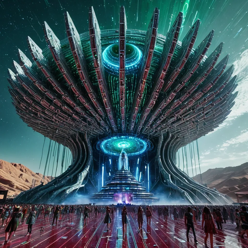 A grand architectural project transformed into a desert music festival venue , with massive , interwoven metal structures forming stages and seating , festival under a sky filled with half-moon and swirling nebulae. The stage is a colossal , fountains structure that pulses with circuit light , projecting impossible visuals. The crowd consists of beings with motherboard texture skin and multiple limbs , dancing to unheard rhythms in rain , silver traces forming a dress , quantum processor eyes , color scheme of crimson green and metallic blue , floating binary code. Style: Surreal , alien , vibrant , with hyper-real stage effects and a dreamlike atmosphere , reminiscent of a psychedelic space opera. ,