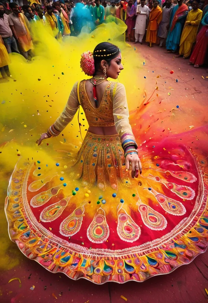 Down to top view , central subject , surreal scene of artwork , traditional festival shoot , futuristic pop art , a Dancer wearing a Chanderi Silk Fancy Lace Work with latkan Kurti Palazzo Dupatta. a Dupatta spiral outward in all directions , creating a dramatic and visually striking effect. surrounded by an explosion of multi-colored powder in shades of red , orange , yellow , green , and blue , with confetti and colorful ribbons swirling around her , and a crowd of similarly dressed figures partially visible in the blurred background , back in frame , parametric , multi-layered. 16K. Hyper fisheye lens effect without vignetting and blur. An abnormally close-up to her profile(from back side). The entire screen is naturally beautiful. The high resolution and fine details are reminiscent of a macro-camera with blur ,