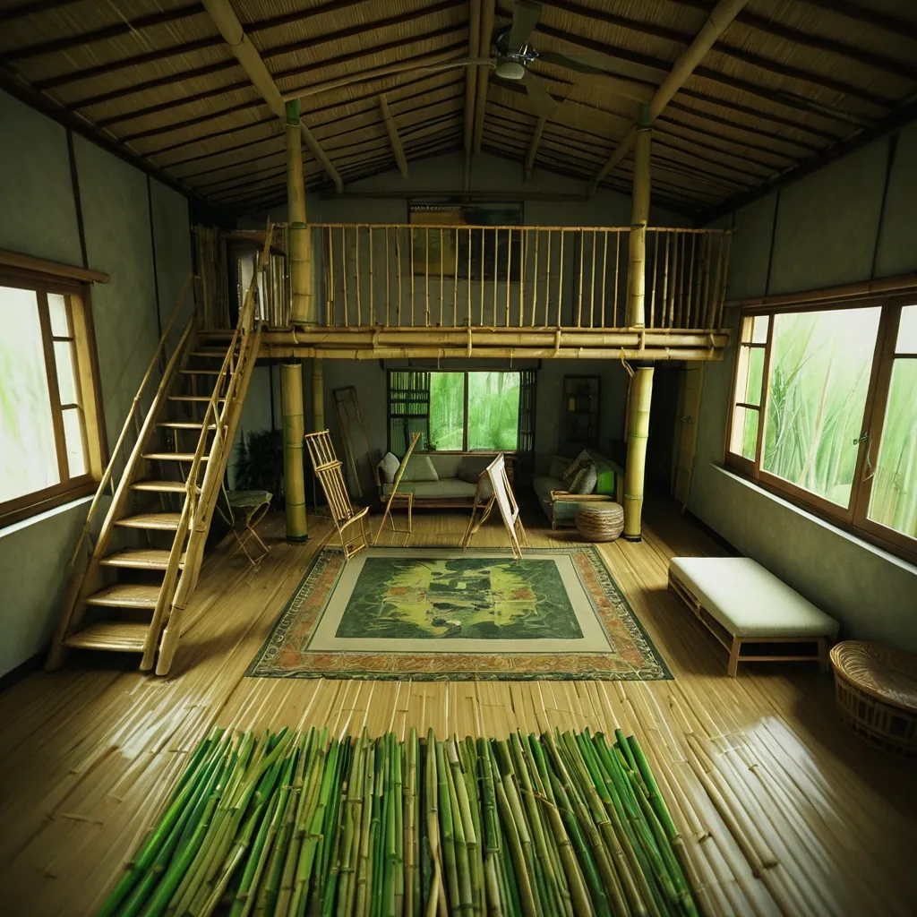 Negatif: buram , cacat , kualitas rendah , anatomi buruk , terdistorsi , jelek , bising , berbintik , tanda air , teks , di luar bingkai , anggota badan tambahan , komposisi buruk , tidak realistis , kartun , lukisan , ilustrasi , perspektif buruk , blur gerakan { "subject": "Interior gubuk bambu dua lantai pedesaan" , "action": "Urutan sinematik selang waktu yang menunjukkan transformasi ruangan bambu kosong menjadi ruang tamu yang nyaman dan lengkap. Dimulai dengan seseorang menyapu lantai beton , kemudian meletakkan lantai tiang bambu hijau cerah. Selanjutnya , tangga bambu ditempatkan , platform lantai dua dibangun dengan pagar , dan tangga diganti dengan tangga bambu yang lebih rumit. Dua orang kemudian menggelar karpet bermotif warna-warni , diikuti dengan penempatan sistematis furnitur bambu buatan tangan: meja samping , rak , bangku panjang , meja kopi , bangku lain , dan meja. Akhirnya , bantal , guling , dan tempat tidur ditambahkan , melengkapi transformasi menjadi hunian bambu dua lantai yang hangat , mengundang , dan berdekorasi lengkap. Seluruh proses ditangkap dalam selang waktu yang konsisten secara visual dan mengalir." , "camera_angle": "Bidikan lebar setinggi mata statis , menangkap seluruh ruangan dari perspektif depan , menampilkan kedalaman dan ketinggian ruang , dengan jendela besar di sebelah kiri yang memperlihatkan lanskap luar yang subur dan berkabut." , "lighting": "Cahaya alami terang dan menyebar yang masuk dari jendela besar , menciptakan suasana hangat dan mengundang dengan gradasi warna alami." , "style": "Fotorealistik , sinematik , buatan tangan , pedesaan , alami , nyaman , selang waktu." } ,