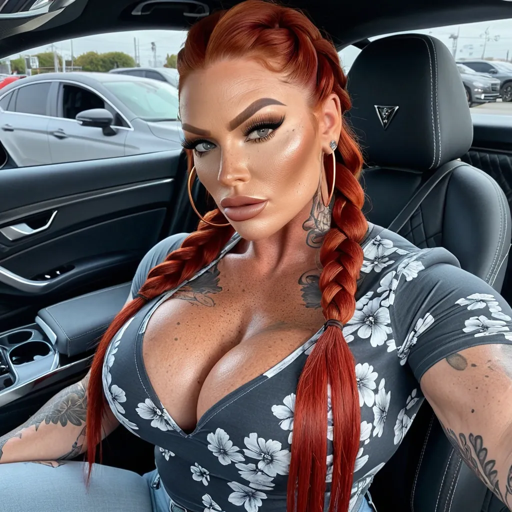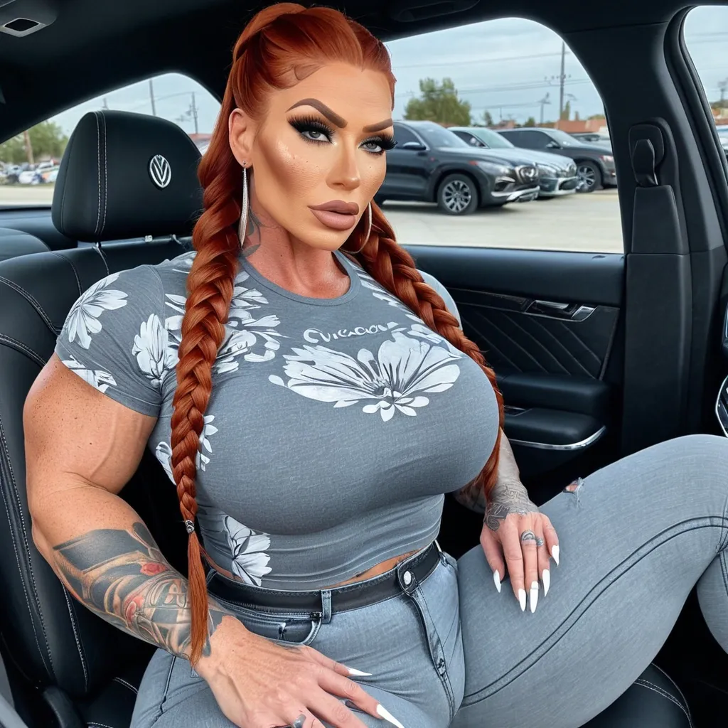 Generate Gorgeous female boss , bimbo , hourglass body , abnormally massive female bodybuilder , gorgeous , close up , full lips , big booty , redheaded , freckles on face and breast , braided design hair , feminine silhouette , too big breast , big booty , sexy thighs abs , silhouette , up close , flexing biceps , beautiful green eyes , legs are iconic and defining physical feature , both visually and in terms of combat ability.wearing an outfit that is a striking blend of elegance , power , and femininity , designed to command attention in any room. The suit is tailored to perfection , hugging the wearer’s curves with precision while emphasizing a structured silhouette. The fabric itself is a refined grey tweed patterned with subtle white grid lines , giving the suit a texture that feels both sophisticated and modern. The blazer features broad blue lapels and gold button accents , adding a luxurious touch that elevates the look beyond typical business attire. The matching high-waisted trousers elongate the frame , further enhancing the poised and commanding effect of the ensemble.The styling choices amplify the boldness of the suit. The inner blouse is a silky , greybutton-down shirt that complements the tweed’s tone while introducing a softer , feminine balance to the sharp tailoring of the jacket. The blouse peeks out neatly from under the blazer , maintaining elegance without drawing focus away from the suit’s commanding cut. Accessories are kept minimal yet intentional: a delicate layered gold necklace and hoop earrings that add glimmers of light and luxury without overpowering the outfit. The choice of voluminous , honey-brown braids cascading down her shoulders frames the face with both confidence and glamour , completing the commanding visual.Altogether , this look communicates a blend of authority and allure. It is business-ready yet fashion-forward , balancing corporate structure with vibrant femininity. The color palette blue , grey and gold avoids being overly delicate , instead embracing the richness of texture , structure , and presence. This is the kind of ensemble that speaks to ambition , sophistication , and personal style—ideal for someone who thrives in positions of influence but insists on expressing her individuality with bold elegance. It’s not just clothing—it’s a statement of power wrapped in grace. In luxury living legs that could crush a watermelon , skirt high boots are a bold and striking statement piece , crafted in glossy black patent leather that gives them a sleek , polished finish. Rising to just below the knee , the boots feature three adjustable buckle straps along the shaft , adding both edge and detail to their design. The towering stiletto heel , paired with a thick platform sole , creates an ultra-dramatic silhouette that elongates the leg and exudes power and confidence. With their combination of shine , height , and structure , these boots perfectly balance fierce femininity with high-fashion allure. Massive breast , massive cleavage , driving and sitting a car , wearing a black , blue amd gray floral t-shirt , gray denim pants , enormous butt ,