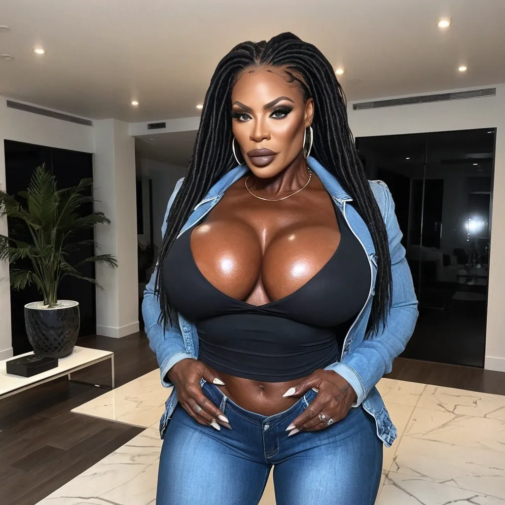 Generate Gorgeous female boss , bimbo , 42 years old , very dark-skinned very African-American female , hourglass body , abnormally massive female bodybuilder , gorgeous , close up , full lips , big booty , full plump lips , on face and breast , dreadlocks , feminine silhouette , too big breast , big booty , sexy thighs abs , silhouette , up close , flexing biceps , gorgeous light-reflecting hazel eyes , legs are iconic and defining physical feature , both visually and in terms of combat ability.wearing an outfit that is a striking blend of elegance , power , and femininity , designed to command attention in any room. The suit is tailored to perfection , hugging the wearer’s curves with precision while emphasizing a structured silhouette. The fabric itself is a refined grey tweed patterned with subtle white grid lines , giving the suit a texture that feels both sophisticated and modern. The blazer features broad blue lapels and gold button accents , adding a luxurious touch that elevates the look beyond typical business attire. The matching high-waisted trousers elongate the frame , further enhancing the poised and commanding effect of the ensemble.The styling choices amplify the boldness of the suit. The inner blouse is a silky , greybutton-down shirt that complements the tweed’s tone while introducing a softer , feminine balance to the sharp tailoring of the jacket. The blouse peeks out neatly from under the blazer , maintaining elegance without drawing focus away from the suit’s commanding cut. Accessories are kept minimal yet intentional: a delicate layered gold necklace and hoop earrings that add glimmers of light and luxury without overpowering the outfit. The choice of voluminous , honey-brown braids cascading down her shoulders frames the face with both confidence and glamour , completing the commanding visual.Altogether , this look communicates a blend of authority and allure. It is business-ready yet fashion-forward , balancing corporate structure with vibrant femininity. The color palette blue , grey and gold avoids being overly delicate , instead embracing the richness of texture , structure , and presence. This is the kind of ensemble that speaks to ambition , sophistication , and personal style—ideal for someone who thrives in positions of influence but insists on expressing her individuality with bold elegance. It’s not just clothing—it’s a statement of power wrapped in grace. In luxury living legs that could crush a watermelon , skirt high boots are a bold and striking statement piece , crafted in glossy black patent leather that gives them a sleek , polished finish. Rising to just below the knee , the boots feature three adjustable buckle straps along the shaft , adding both edge and detail to their design. The towering stiletto heel , paired with a thick platform sole , creates an ultra-dramatic silhouette that elongates the leg and exudes power and confidence. With their combination of shine , height , and structure , these boots perfectly balance fierce femininity with high-fashion allure. High cheekbones , prominent jawline , gorgeous big light reflecting hazel eyes , enormous breast , v-neck black t-shirt , denim jackets , denim pants standing in living room ,