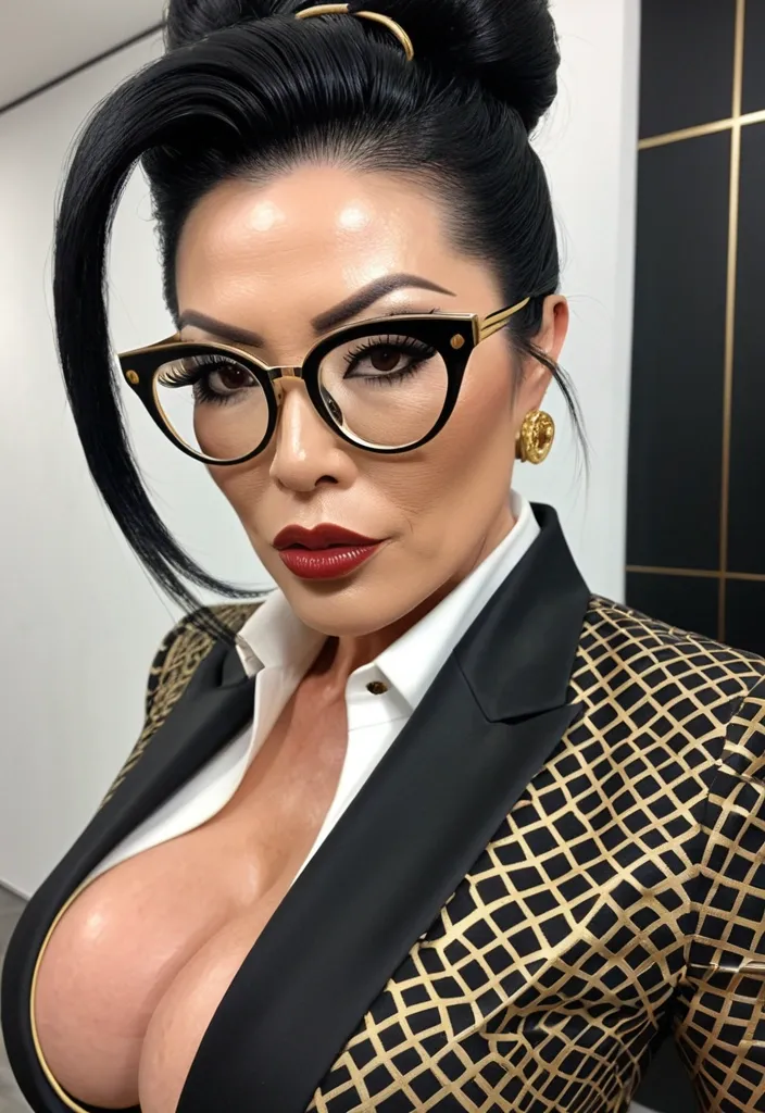 Generate Gorgeous female boss , 43 years old , bimbo , Japanese woman , hourglass body , abnormally massive female bodybuilder , gorgeous , close up , full lips , big booty , black hair , circle eyeglasses , pompadour updo hair style , feminine silhouette , too big breast , big booty , sexy thighs abs , silhouette , up close , flexing biceps , beautiful brown eyes , legs are iconic and defining physical feature , both visually and in terms of combat ability.wearing an outfit that is a striking blend of elegance , power , and femininity , designed to command attention in any room. The suit is tailored to perfection , hugging the wearer’s curves with precision while emphasizing a structured silhouette. The fabric itself is a refined grey tweed patterned with subtle white grid lines , giving the suit a texture that feels both sophisticated and modern. The blazer features broad blue lapels and gold button accents , adding a luxurious touch that elevates the look beyond typical business attire. The matching high-waisted trousers elongate the frame , further enhancing the poised and commanding effect of the ensemble.The styling choices amplify the boldness of the suit. The inner blouse is a silky , greybutton-down shirt that complements the tweed’s tone while introducing a softer , feminine balance to the sharp tailoring of the jacket. The blouse peeks out neatly from under the blazer , maintaining elegance without drawing focus away from the suit’s commanding cut. Accessories are kept minimal yet intentional: a delicate layered gold necklace and hoop earrings that add glimmers of light and luxury without overpowering the outfit. The choice of voluminous , honey-brown braids cascading down her shoulders frames the face with both confidence and glamour , completing the commanding visual.Altogether , this look communicates a blend of authority and allure. It is business-ready yet fashion-forward , balancing corporate structure with vibrant femininity. The color palette blue , grey and gold avoids being overly delicate , instead embracing the richness of texture , structure , and presence. This is the kind of ensemble that speaks to ambition , sophistication , and personal style—ideal for someone who thrives in positions of influence but insists on expressing her individuality with bold elegance. It’s not just clothing—it’s a statement of power wrapped in grace. In luxury living legs that could crush a watermelon , skirt high boots are a bold and striking statement piece , crafted in glossy black patent leather that gives them a sleek , polished finish. Rising to just below the knee , the boots feature three adjustable buckle straps along the shaft , adding both edge and detail to their design. The towering stiletto heel , paired with a thick platform sole , creates an ultra-dramatic silhouette that elongates the leg and exudes power and confidence. With their combination of shine , height , and structure , these boots perfectly balance fierce femininity with high-fashion allure. Massive breast , , Up close shot , black and gold blazer , and white blouse ,
