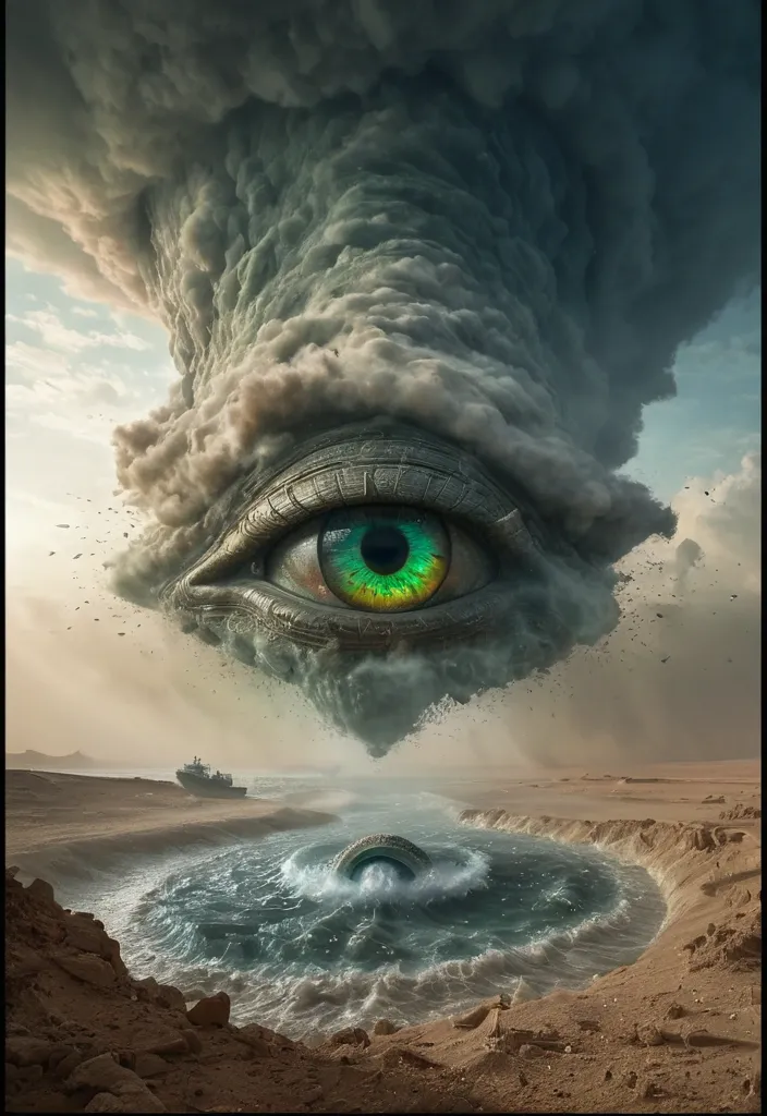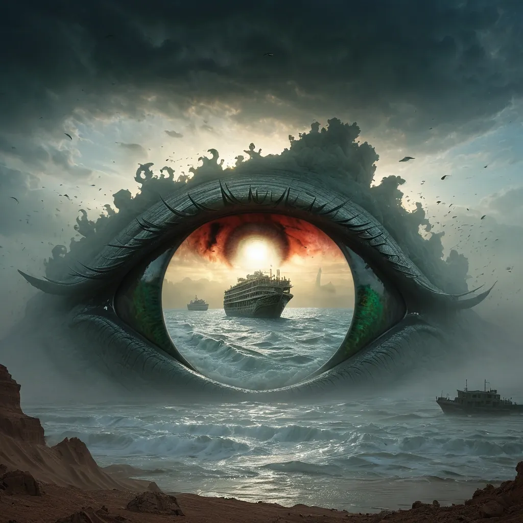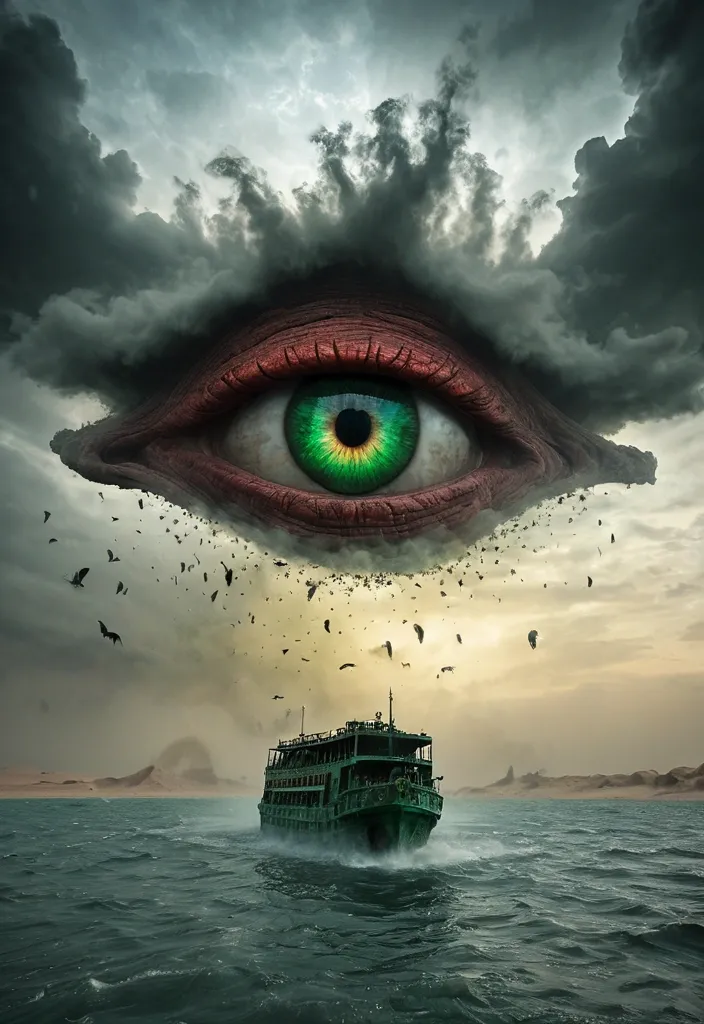 Debris—stones , dust , and fragments—rise from the ground , suspended within the turbulence. appears to dissolve into a shifting , storm-like formation made of blues , greens , yellows , and muted reds. Emerging from this mist is a single giant Crocodile eye , its iris a vivid blend of red and green , the pupil dark and centered. The eyelashes are rendered with striking detail , tapering outward as though the eye belongs to something alive hidden within the vapor. In the iris , a eyelid frame is partially embedded in the clouded sky , revealing a Ferries ship in wavy ocean beyond it. Arabian desert and in front a silhouette of Ancient Arabs migrate with their camels coming from giant iris. The surrounding clouds billow up to the ceiling. ,