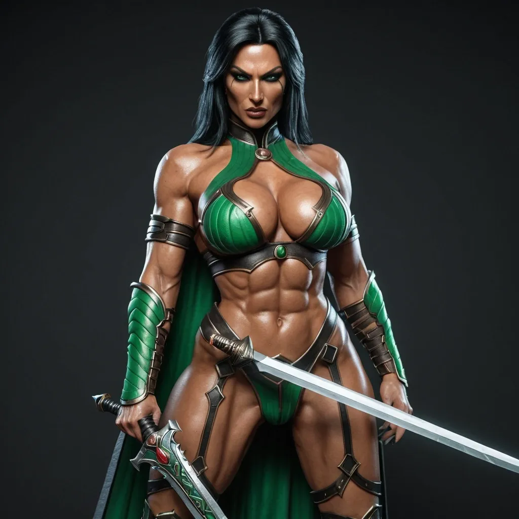 Image is an oil digital illustration featuring a powerful female warrior in a dynamic pose. She has long , flowing black hair and a determined expression. Her skin is light , and she has striking facial features with bold makeup. The character is adorned in a metallic silver and red armor , with intricate designs and a prominent chest plate. Her arms are wrapped in black and red fabric , and she holds a large , imposing sword with a weathered blade. The background is concrete grey and blood red , enhancing the dramatic and intense atmosphere of the scene. The overall composition is bold and visually striking , emphasizing strength and confidence. ,