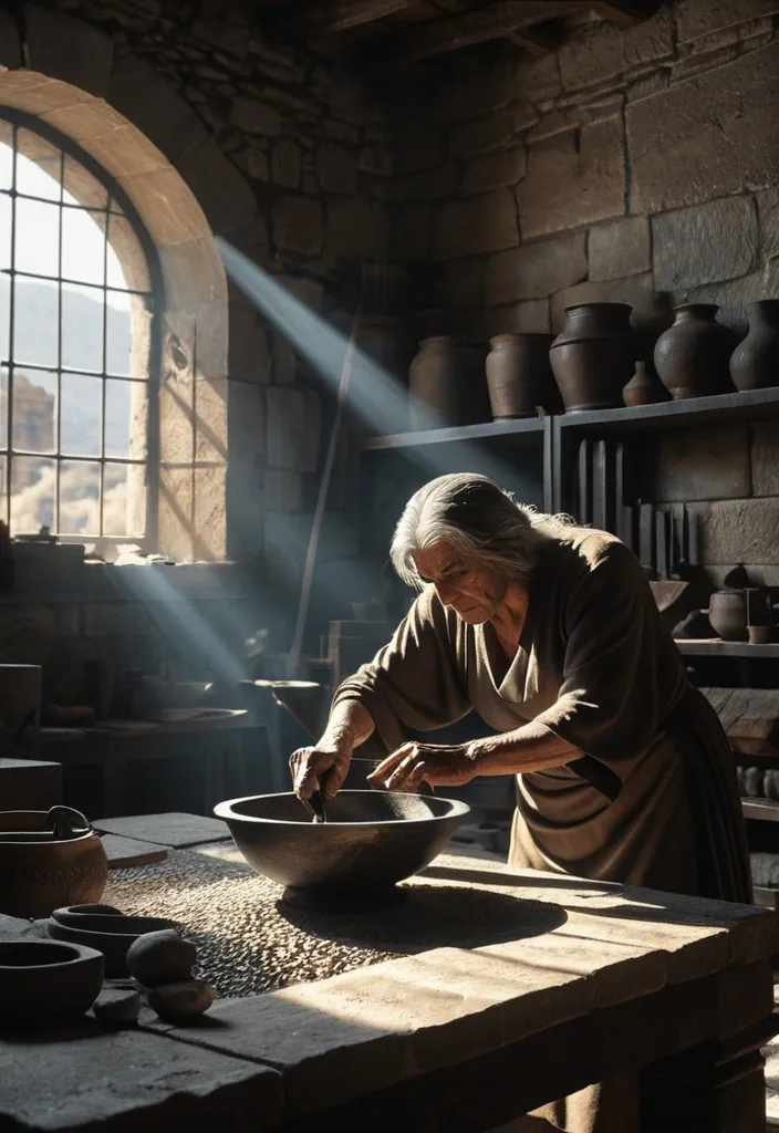 “Square 1:1 (1080x1080) , ultra photorealistic cinematic scene , historical ancient setting , elegant and symbolic , high realism. ERA: Ancient metal workshop (biblical era). LOCATION: Interior of a stone workshop with natural side light entering through a small window. CENTRAL SCENE: An older female artisan carefully refining silver over controlled fire. Her expression is calm , focused , disciplined. SYMBOLIC DETAIL: On one side of the table lies raw , dark ore. On the other side , a small piece of refined silver rests — smooth , pure , luminous but not glowing artificially. No supernatural beams. No dramatic heavenly light. Only natural realism and symbolism of refinement. ATMOSPHERE: Silence , discipline , process , maturity. COLOR PALETTE: Earth tones , muted browns , subtle metallic reflections. TEXT overlay (bold elegant serif): Top center: ‘LA LENGUA QUE VALE ORO’ Below smaller: ‘Proverbios 10:20’ Bottom-right corner: ‘EL PODER DE LA PALABRA DE DIOS’ Ultra realistic Cinematic depth No glow effects No clichés No exaggerated light rays” ,