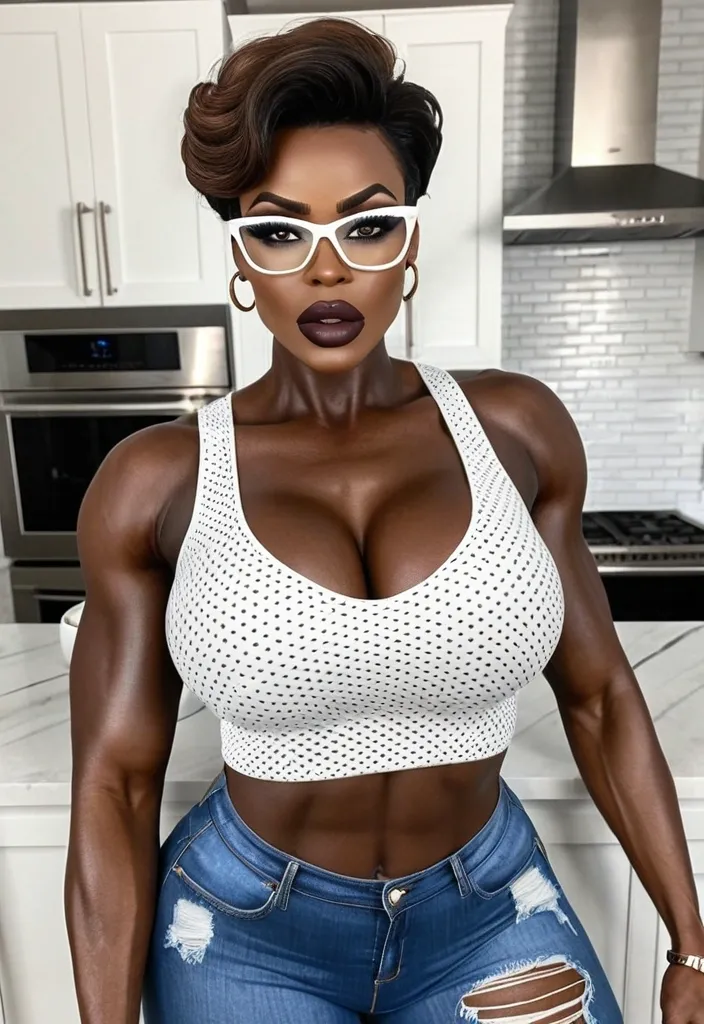 Generate Gorgeous female boss , bimbo , wye glasses , very dark-skinned African-American woman , very big lips , hourglass body , abnormally massive female bodybuilder , gorgeous , close up , full lips , big booty , brown hair , short pixie hair , feminine silhouette , too big breast , big booty , sexy thighs abs , silhouette , up close , flexing biceps , beautiful brown eyes , legs are iconic and defining physical feature , both visually and in terms of combat ability.wearing an outfit that is a striking blend of elegance , power , and femininity , designed to command attention in any room. The suit is tailored to perfection , hugging the wearer’s curves with precision while emphasizing a structured silhouette. The fabric itself is a refined grey tweed patterned with subtle white grid lines , giving the suit a texture that feels both sophisticated and modern. The blazer features broad blue lapels and gold button accents , adding a luxurious touch that elevates the look beyond typical business attire. The matching high-waisted trousers elongate the frame , further enhancing the poised and commanding effect of the ensemble.The styling choices amplify the boldness of the suit. The inner blouse is a silky , greybutton-down shirt that complements the tweed’s tone while introducing a softer , feminine balance to the sharp tailoring of the jacket. The blouse peeks out neatly from under the blazer , maintaining elegance without drawing focus away from the suit’s commanding cut. Accessories are kept minimal yet intentional: a delicate layered gold necklace and hoop earrings that add glimmers of light and luxury without overpowering the outfit. The choice of voluminous , honey-brown braids cascading down her shoulders frames the face with both confidence and glamour , completing the commanding visual.Altogether , this look communicates a blend of authority and allure. It is business-ready yet fashion-forward , balancing corporate structure with vibrant femininity. The color palette blue , grey and gold avoids being overly delicate , instead embracing the richness of texture , structure , and presence. This is the kind of ensemble that speaks to ambition , sophistication , and personal style—ideal for someone who thrives in positions of influence but insists on expressing her individuality with bold elegance. It’s not just clothing—it’s a statement of power wrapped in grace. In luxury living legs that could crush a watermelon , skirt high boots are a bold and striking statement piece , crafted in glossy black patent leather that gives them a sleek , polished finish. Rising to just below the knee , the boots feature three adjustable buckle straps along the shaft , adding both edge and detail to their design. The towering stiletto heel , paired with a thick platform sole , creates an ultra-dramatic silhouette that elongates the leg and exudes power and confidence. With their combination of shine , height , and structure , these boots perfectly balance fierce femininity with high-fashion allure. High cheekbones , prominent jawline , gorgeous big brown eyes , , enormous breast , white and blue pin-dot patterned tank top , high rise denim jeans in kitchen ,