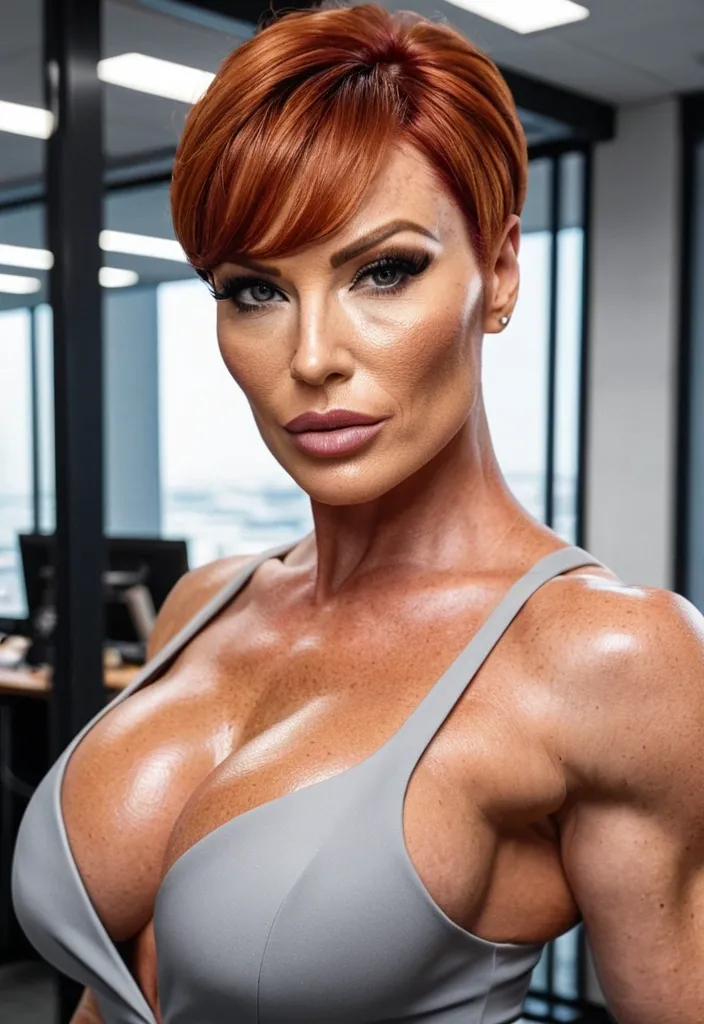 Generate Gorgeous female boss , bimbo , hourglass body , abnormally massive female bodybuilder , gorgeous , close up , full lips , big booty , redheaded , freckles on face and breast , Her hairstyle is a short pixie cut , neatly shaped close to the head with soft waves and texture throughout. The bangs are lightly feathered in the front , giving her a clean , classic , elegant look that frames her face beautifully. , feminine silhouette , too big breast , big booty , sexy thighs abs , silhouette , up close , flexing biceps , beautiful green eyes , legs are iconic and defining physical feature , both visually and in terms of combat ability.wearing an outfit that is a striking blend of elegance , power , and femininity , designed to command attention in any room. The suit is tailored to perfection , hugging the wearer’s curves with precision while emphasizing a structured silhouette. The fabric itself is a refined grey tweed patterned with subtle white grid lines , giving the suit a texture that feels both sophisticated and modern. The blazer features broad blue lapels and gold button accents , adding a luxurious touch that elevates the look beyond typical business attire. The matching high-waisted trousers elongate the frame , further enhancing the poised and commanding effect of the ensemble.The styling choices amplify the boldness of the suit. The inner blouse is a silky , greybutton-down shirt that complements the tweed’s tone while introducing a softer , feminine balance to the sharp tailoring of the jacket. The blouse peeks out neatly from under the blazer , maintaining elegance without drawing focus away from the suit’s commanding cut. Accessories are kept minimal yet intentional: a delicate layered gold necklace and hoop earrings that add glimmers of light and luxury without overpowering the outfit. The choice of voluminous , honey-brown braids cascading down her shoulders frames the face with both confidence and glamour , completing the commanding visual.Altogether , this look communicates a blend of authority and allure. It is business-ready yet fashion-forward , balancing corporate structure with vibrant femininity. The color palette blue , grey and gold avoids being overly delicate , instead embracing the richness of texture , structure , and presence. This is the kind of ensemble that speaks to ambition , sophistication , and personal style—ideal for someone who thrives in positions of influence but insists on expressing her individuality with bold elegance. It’s not just clothing—it’s a statement of power wrapped in grace. In luxury living legs that could crush a watermelon , skirt high boots are a bold and striking statement piece , crafted in glossy black patent leather that gives them a sleek , polished finish. Rising to just below the knee , the boots feature three adjustable buckle straps along the shaft , adding both edge and detail to their design. The towering stiletto heel , paired with a thick platform sole , creates an ultra-dramatic silhouette that elongates the leg and exudes power and confidence. With their combination of shine , height , and structure , these boots perfectly balance fierce femininity with high-fashion allure. Teal and pink , swede and leather t-shirt , enormous breast , enormous butt , modest top , closed top collar , zipped up top , Her outfit is loud , powerful , and bright — the kind of style that takes over a room the second she walks in. The top portion combines glossy black with bold yellow , forming a futuristic , body-contoured suit that looks engineered more than simply sewn. The high shine material reflects light like a lacquered automotive finish — clean , smooth , and aggressively high fashion. It gives the impression of authority , confidence , and full control.The skirt continues that same energy — a sleek , high-waisted bright yellow pencil style that molds to her shape like a sculptor’s signature piece. The belt , solid black with metallic hardware , breaks the yellow just enough to sharpen the silhouette and emphasize her waist. The entire look feels intentionally aerodynamic — almost superhero executive couture — the type of uniform someone elite in a powerful syndicate or futuristic megacorp would wear as standard.Her long straight hair with bangs , paired with hoop earrings and sharp red nails , completes the aesthetic with a modern feminine edge. It’s a blend of dominance , elegance , and danger — like she’s the CEO of a high-security tech empire who can crush a corporate takeover before breakfast , and look immaculate doing it. This outfit isn’t just fashion — it’s a message. ,