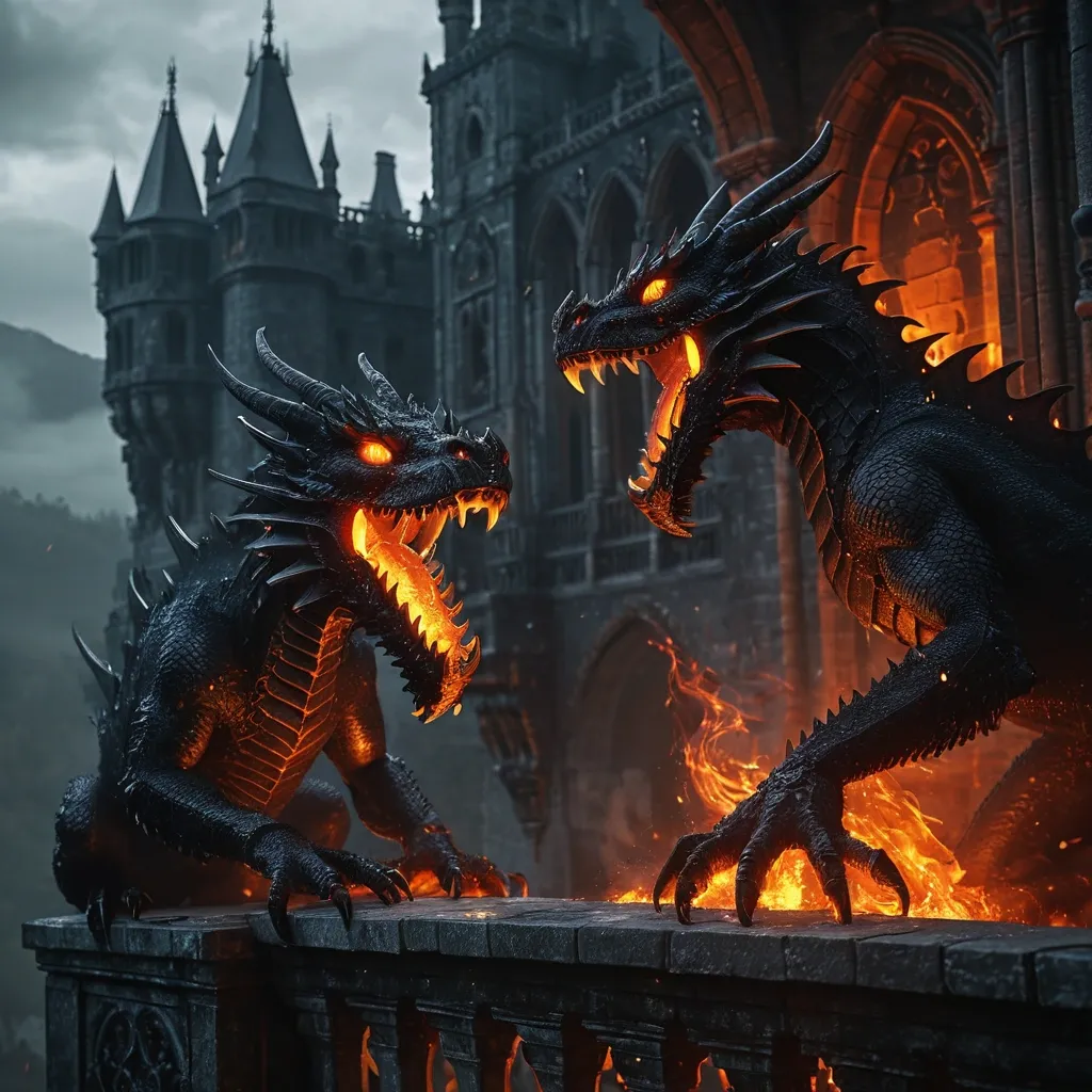 Dos formidables dragones de escamas oscuras , con brillantes ojos naranjas y dientes afilados , uno emergiendo por la izquierda , otro por la derecha con la boca abierta y ardiente , se enfrentaron en un dramático enfrentamiento sobre un balcón con balaustradas de piedra ornamentadas y braseros encendidos , con vistas a un paisaje oscuro y brumoso con castillos góticos distantes y un denso bosque. Estilo: Arte fantástico , Pintura digital. Iluminación: Dramática , Resplandor ardiente , Iluminación volumétrica. Composición: Plano general , Ángulos dinámicos , Regla de los tercios. Detalles: Intrincadas escamas de dragón , brasas brillantes , humo y niebla , trabajo detallado en piedra , atmósfera épica , intensos efectos de fuego , arquitectura gótica , presencia amenazante. Calidad: Alto detalle , 4K , Obra maestra , Calidad de arte conceptual. ,