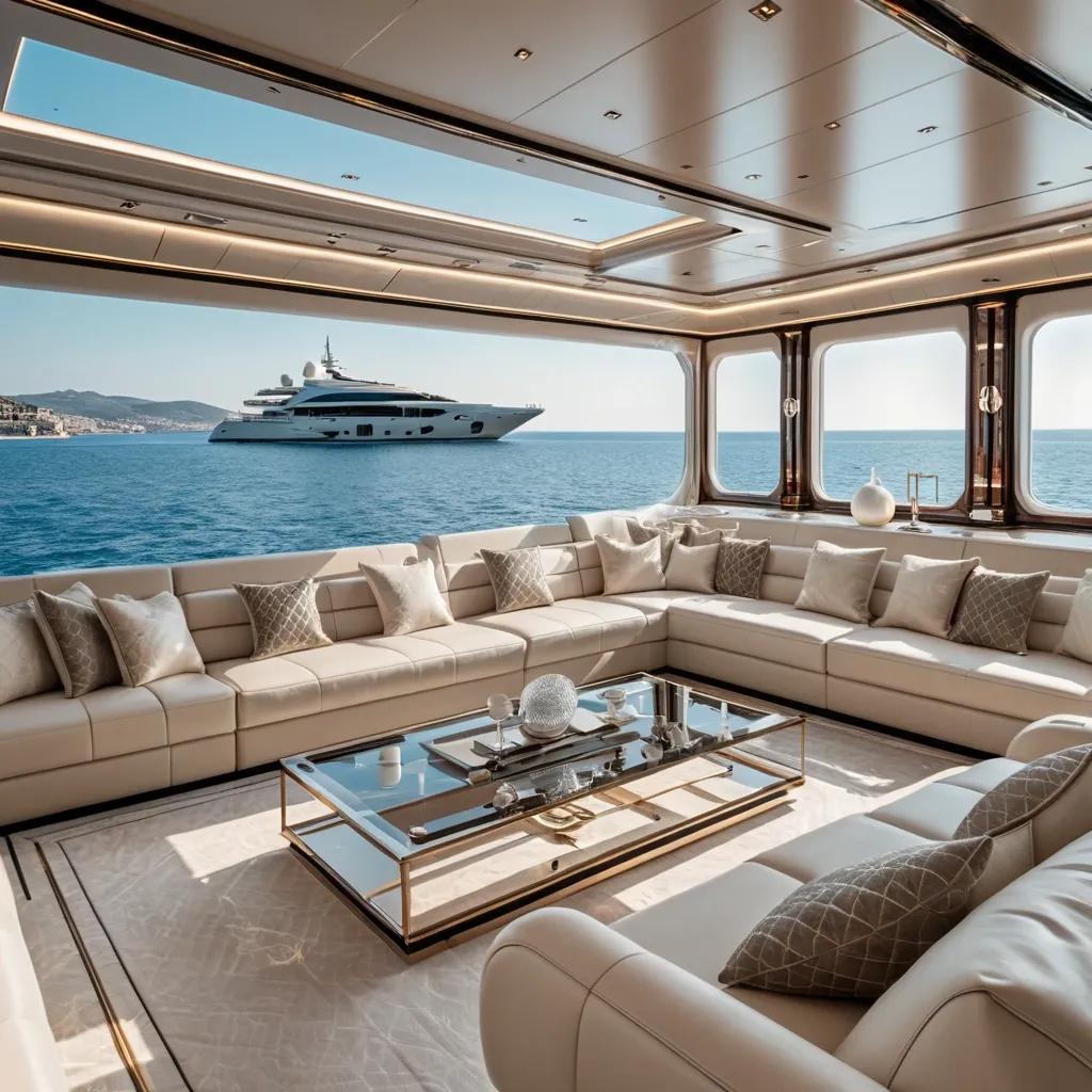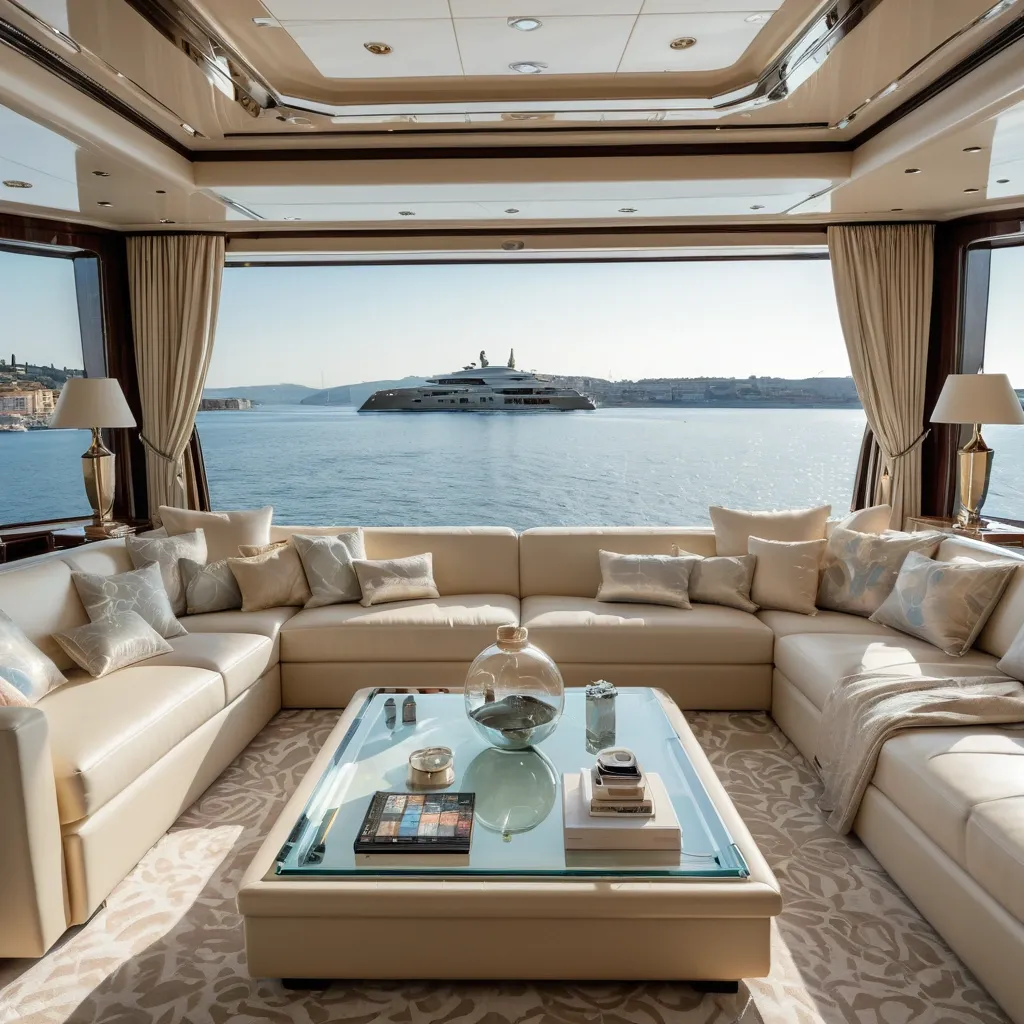 This luxurious living room on a luxury yacht a panoramic window showing the mediterranian sea , in the Naples area. The furniture is plush and inviting , with plush sofas and armchairs upholstered in soft , cream-colored fabric. A large , rectangular coffee table made of clear glass sits at the center of the room , and a few decorative pillows add pops of color. A few high-tech gadgets , such as a holographic display and a floating shelf , add a futuristic touch ,