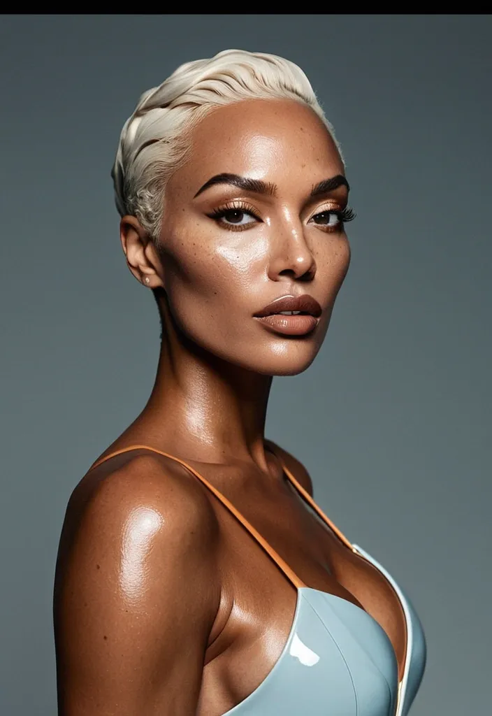 Light-skinned African-American woman — extremely beautiful , with a presence that feels quietly dangerous and quietly royal at the same time. She has that soft glow in her skin that looks effortless , like she wakes up looking like this every day without trying , but everyone knows she still probably puts in discipline the old fashioned way. Her bone structure is model tier… cheekbones that could cut through pride , a jawline that says she doesn’t bend for just anybody , and soft lips that hold mystery and restraint all at once.Her short hair is cropped close , styled in textured waves that shape her face like an artist’s finishing brush stroke. It gives her a striking , modern elegance — feminine , but with that slight edge that tells you she’s not the type anyone ever controls. Her eyebrows are naturally bold and shaped sharply , framing her icy blue eyes that practically glow with their own weather system. Those eyes… you could lose a fight in those eyes before she ever speaks a word.She has luminous , glossy skin that reflects light like polished bronze catching early morning sun. Natural freckles sprinkle just lightly across her cheeks , softening the intimidation factor with a hint of youthful innocence. The way the light hits her face makes her look sculpted — like an ultra realistic painting brought to life. Everything about her looks intentional… but also like she was born this way.There’s also this quiet calm in her expression — not emotional weakness — but a poised , unshakeable stillness that only comes from knowing exactly who you are and not needing to defend it. She looks like the woman who never rushes into noise… she waits , she observes , she lets the room shift around her while she remains unmoved. That alone is power — and she wears it naturally like an old soul who understands her worth in ways other people are still scrambling to figure out , blonde short pompadour hair , beige and orange velvet bodysuit , gold necklace ,