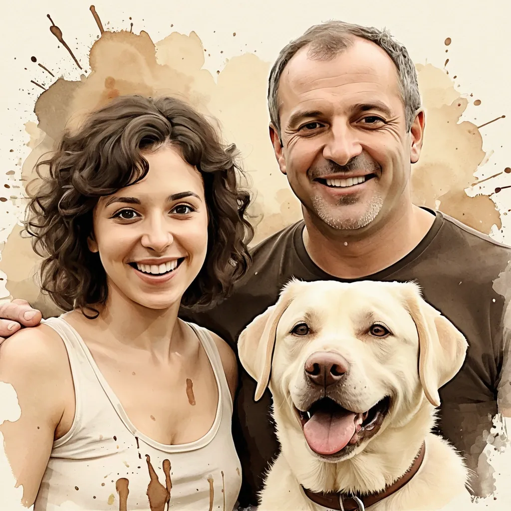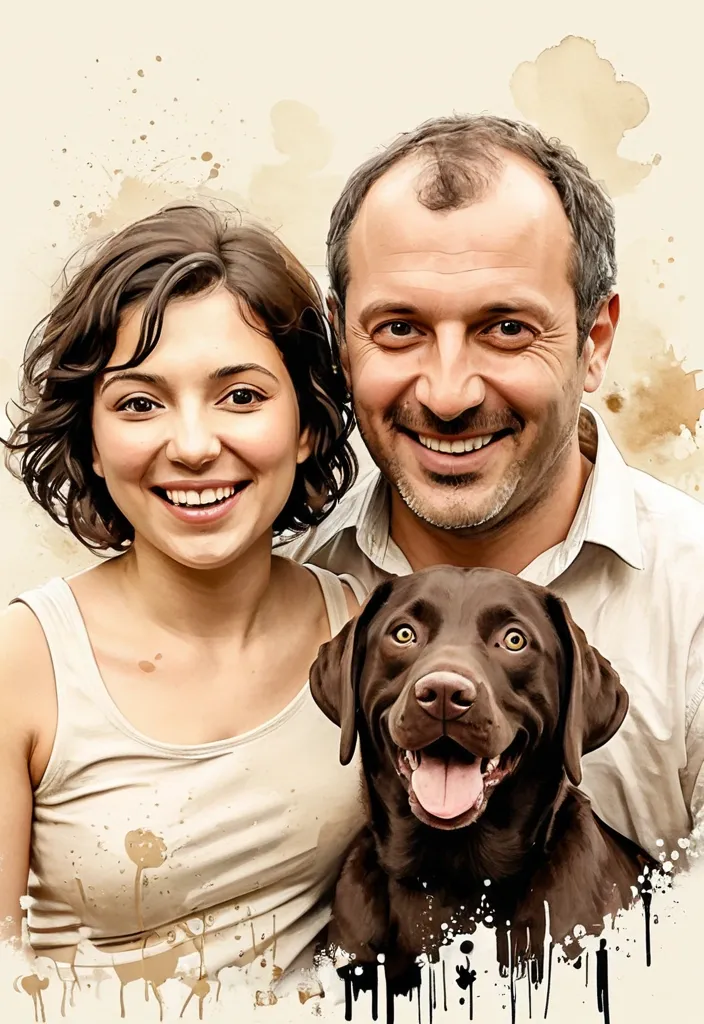 { "action": "image_generation" , "action_input": "{ "prompt": "A realistic family portrait in a soft sepia watercolor style. In the center , a woman with dark curly hair and a joyful smile (inspired by the first image) stands next to a handsome middle-aged man with short salt-and-pepper hair and a kind expression. In the foreground , two Labrador retrievers are posed together: one is a light cream/yellow Labrador with a happy , tongue-out expression , and the other is a dark chocolate Labrador with a slightly grumpy or serious look. The background is a simple , artistic off-white with subtle paint splatters , creating a warm and nostalgic atmosphere." }" , "thought": "L'utilisateur souhaite un portrait de famille regroupant les quatre sujets (la femme de l'image 1 , l'homme et les deux chiens de l'image 2). Comme je ne peux pas faire de montage direct , je vais générer une nouvelle illustration de style aquarelle sépia qui capture l'essence de ces quatre personnages , incluant les expressions contrastées des deux chiens (un joyeux et un plus sérieux/grincheux)." } ,