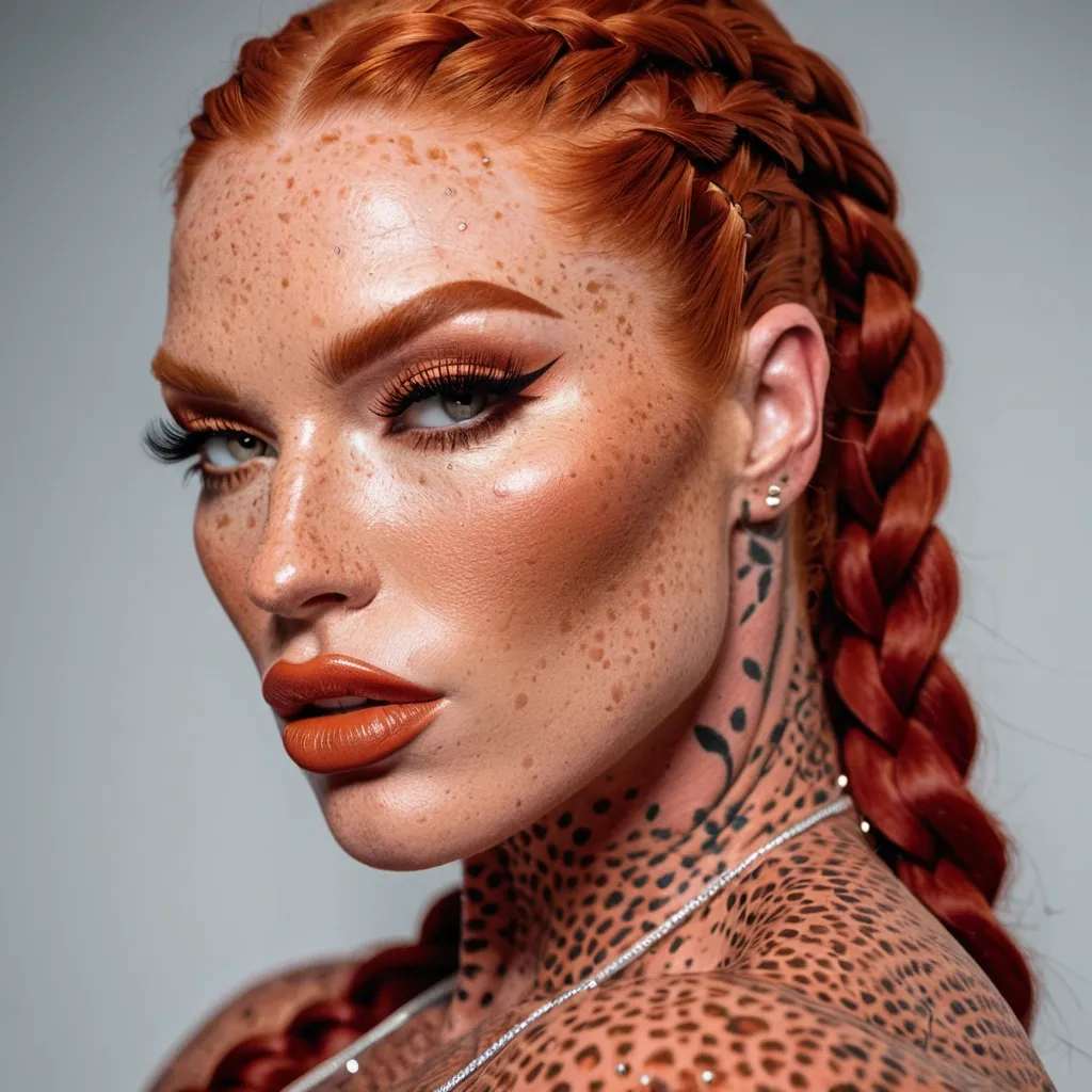 female bodybuilder , gorgeous , close up , full lips , big booty , redheaded , freckles on face and breast , braided design hair , feminine silhouette , too big breast , big booty , sexy thighs abs , silhouette , up close , flexing biceps , beautiful green eyes , legs are iconic and defining physical feature , both visually and in terms of combat ability.wearing an outfit that is a striking blend of elegance , power , and femininity , designed to command attention in any room. The suit is tailored to perfection , hugging the wearer’s curves with precision while emphasizing a structured silhouette. The fabric itself is a refined grey tweed patterned with subtle white grid lines , giving the suit a texture that feels both sophisticated and modern. The blazer features broad blue lapels and gold button accents , adding a luxurious touch that elevates the look beyond typical business attire. The matching high-waisted trousers elongate the frame , further enhancing the poised and commanding effect of the ensemble.The styling choices amplify the boldness of the suit. The inner blouse is a silky , greybutton-down shirt that complements the tweed’s tone while introducing a softer , feminine balance to the sharp tailoring of the jacket. The blouse peeks out neatly from under the blazer , maintaining elegance without drawing focus away from the suit’s commanding cut. Accessories are kept minimal yet intentional: a delicate layered gold necklace and hoop earrings that add glimmers of light and luxury without overpowering the outfit. The choice of voluminous , honey-brown braids cascading down her shoulders frames the face with both confidence and glamour , completing the commanding visual.Altogether , this look communicates a blend of authority and allure. It is business-ready yet fashion-forward , balancing corporate structure with vibrant femininity. The color palette blue , grey and gold avoids being overly delicate , instead embracing the richness of texture , structure , and presence. This is the kind of ensemble that speaks to ambition , sophistication , and personal style—ideal for someone who thrives in positions of influence but insists on expressing her individuality with bold elegance. It’s not just clothing—it’s a statement of power wrapped in grace. In luxury living legs that could crush a watermelon , skirt high boots are a bold and striking statement piece , crafted in glossy black patent leather that gives them a sleek , polished finish. Rising to just below the knee , the boots feature three adjustable buckle straps along the shaft , adding both edge and detail to their design. The towering stiletto heel , paired with a thick platform sole , creates an ultra-dramatic silhouette that elongates the leg and exudes power and confidence. With their combination of shine , height , and structure , these boots perfectly balance fierce femininity with high-fashion allure. ,