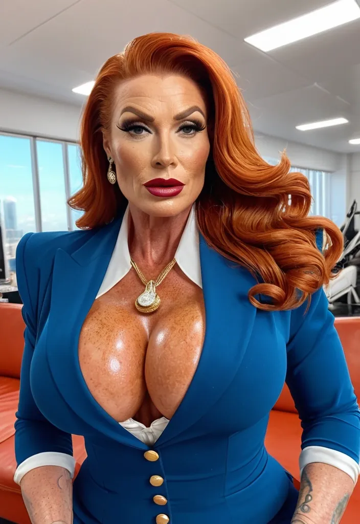 Generate Gorgeous female boss , 42 years old , bimbo , hourglass body , abnormally massive female bodybuilder , gorgeous , close up , full lips , big booty , redheaded , freckles on face and breast , 1940s styled hair , feminine silhouette , too big breast , big booty , sexy thighs abs , silhouette , up close , flexing biceps , beautiful green eyes , legs are iconic and defining physical feature , both visually and in terms of combat ability.wearing an outfit that is a striking blend of elegance , power , and femininity , designed to command attention in any room. The suit is tailored to perfection , hugging the wearer’s curves with precision while emphasizing a structured silhouette. The fabric itself is a refined grey tweed patterned with subtle white grid lines , giving the suit a texture that feels both sophisticated and modern. The blazer features broad blue lapels and gold button accents , adding a luxurious touch that elevates the look beyond typical business attire. The matching high-waisted trousers elongate the frame , further enhancing the poised and commanding effect of the ensemble.The styling choices amplify the boldness of the suit. The inner blouse is a silky , greybutton-down shirt that complements the tweed’s tone while introducing a softer , feminine balance to the sharp tailoring of the jacket. The blouse peeks out neatly from under the blazer , maintaining elegance without drawing focus away from the suit’s commanding cut. Accessories are kept minimal yet intentional: a delicate layered gold necklace and hoop earrings that add glimmers of light and luxury without overpowering the outfit. The choice of voluminous , honey-brown braids cascading down her shoulders frames the face with both confidence and glamour , completing the commanding visual.Altogether , this look communicates a blend of authority and allure. It is business-ready yet fashion-forward , balancing corporate structure with vibrant femininity. The color palette blue , grey and gold avoids being overly delicate , instead embracing the richness of texture , structure , and presence. This is the kind of ensemble that speaks to ambition , sophistication , and personal style—ideal for someone who thrives in positions of influence but insists on expressing her individuality with bold elegance. It’s not just clothing—it’s a statement of power wrapped in grace. In luxury living legs that could crush a watermelon , skirt high boots are a bold and striking statement piece , crafted in glossy black patent leather that gives them a sleek , polished finish. Rising to just below the knee , the boots feature three adjustable buckle straps along the shaft , adding both edge and detail to their design. The towering stiletto heel , paired with a thick platform sole , creates an ultra-dramatic silhouette that elongates the leg and exudes power and confidence. With their combination of shine , height , and structure , these boots perfectly balance fierce femininity with high-fashion allure. Enormous breast , small waist , enormous butt , sky blueBlazer , white t-shirt , gold got tie necklace ,