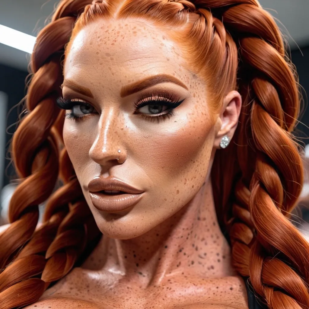 Generate Gorgeous female boss , bimbo , hourglass body , abnormally massive female bodybuilder , gorgeous , close up , full lips , big booty , redheaded , freckles on face and breast , braided design hair , feminine silhouette , too big breast , big booty , sexy thighs abs , silhouette , up close , flexing biceps , beautiful green eyes , legs are iconic and defining physical feature , both visually and in terms of combat ability.wearing an outfit that is a striking blend of elegance , power , and femininity , designed to command attention in any room. The suit is tailored to perfection , hugging the wearer’s curves with precision while emphasizing a structured silhouette. The fabric itself is a refined grey tweed patterned with subtle white grid lines , giving the suit a texture that feels both sophisticated and modern. The blazer features broad blue lapels and gold button accents , adding a luxurious touch that elevates the look beyond typical business attire. The matching high-waisted trousers elongate the frame , further enhancing the poised and commanding effect of the ensemble.The styling choices amplify the boldness of the suit. The inner blouse is a silky , greybutton-down shirt that complements the tweed’s tone while introducing a softer , feminine balance to the sharp tailoring of the jacket. The blouse peeks out neatly from under the blazer , maintaining elegance without drawing focus away from the suit’s commanding cut. Accessories are kept minimal yet intentional: a delicate layered gold necklace and hoop earrings that add glimmers of light and luxury without overpowering the outfit. The choice of voluminous , honey-brown braids cascading down her shoulders frames the face with both confidence and glamour , completing the commanding visual.Altogether , this look communicates a blend of authority and allure. It is business-ready yet fashion-forward , balancing corporate structure with vibrant femininity. The color palette blue , grey and gold avoids being overly delicate , instead embracing the richness of texture , structure , and presence. This is the kind of ensemble that speaks to ambition , sophistication , and personal style—ideal for someone who thrives in positions of influence but insists on expressing her individuality with bold elegance. It’s not just clothing—it’s a statement of power wrapped in grace. In luxury living legs that could crush a watermelon , skirt high boots are a bold and striking statement piece , crafted in glossy black patent leather that gives them a sleek , polished finish. Rising to just below the knee , the boots feature three adjustable buckle straps along the shaft , adding both edge and detail to their design. The towering stiletto heel , paired with a thick platform sole , creates an ultra-dramatic silhouette that elongates the leg and exudes power and confidence. With their combination of shine , height , and structure , these boots perfectly balance fierce femininity with high-fashion allure. ,