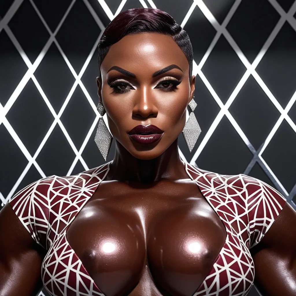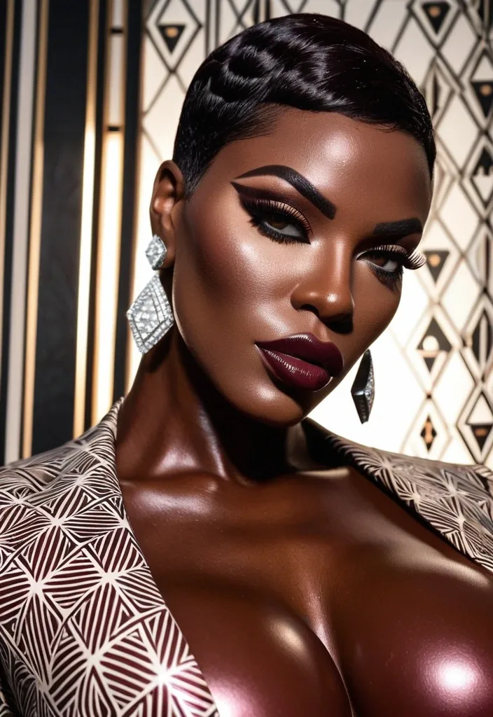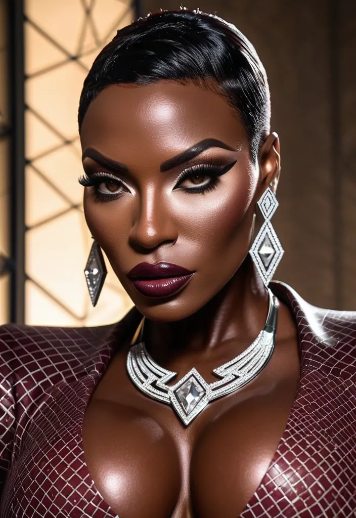 Generate Gorgeous female boss , bimbo , dark-skinned very African-American female , hourglass body , abnormally massive female bodybuilder , gorgeous , close up , full lips , big booty , brown , on face and breast , 1940s short pixie hair , feminine silhouette , too big breast , big booty , sexy thighs abs , silhouette , up close , flexing biceps , beautiful green eyes , legs are iconic and defining physical feature , both visually and in terms of combat ability.wearing an outfit that is a striking blend of elegance , power , and femininity , designed to command attention in any room. The suit is tailored to perfection , hugging the wearer’s curves with precision while emphasizing a structured silhouette. The fabric itself is a refined grey tweed patterned with subtle white grid lines , giving the suit a texture that feels both sophisticated and modern. The blazer features broad blue lapels and gold button accents , adding a luxurious touch that elevates the look beyond typical business attire. The matching high-waisted trousers elongate the frame , further enhancing the poised and commanding effect of the ensemble.The styling choices amplify the boldness of the suit. The inner blouse is a silky , greybutton-down shirt that complements the tweed’s tone while introducing a softer , feminine balance to the sharp tailoring of the jacket. The blouse peeks out neatly from under the blazer , maintaining elegance without drawing focus away from the suit’s commanding cut. Accessories are kept minimal yet intentional: a delicate layered gold necklace and hoop earrings that add glimmers of light and luxury without overpowering the outfit. The choice of voluminous , honey-brown braids cascading down her shoulders frames the face with both confidence and glamour , completing the commanding visual.Altogether , this look communicates a blend of authority and allure. It is business-ready yet fashion-forward , balancing corporate structure with vibrant femininity. The color palette blue , grey and gold avoids being overly delicate , instead embracing the richness of texture , structure , and presence. This is the kind of ensemble that speaks to ambition , sophistication , and personal style—ideal for someone who thrives in positions of influence but insists on expressing her individuality with bold elegance. It’s not just clothing—it’s a statement of power wrapped in grace. In luxury living legs that could crush a watermelon , skirt high boots are a bold and striking statement piece , crafted in glossy black patent leather that gives them a sleek , polished finish. Rising to just below the knee , the boots feature three adjustable buckle straps along the shaft , adding both edge and detail to their design. The towering stiletto heel , paired with a thick platform sole , creates an ultra-dramatic silhouette that elongates the leg and exudes power and confidence. With their combination of shine , height , and structure , these boots perfectly balance fierce femininity with high-fashion allure. High cheekbones , prominent jawline , gorgeous big light reflecting hazel eyes , enormous breast , diamond earrings , black , dark burgundy and pearl white geometric patterns ,
