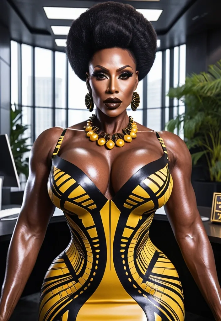 Generate Gorgeous 42 years old , female boss , dark-skinned African-American woman , pointy face , bimbo , hourglass body , abnormally massive female bodybuilder , gorgeous , close up , full lips , big booty , stylish futuristic afro , , feminine silhouette , too big breast , big booty , sexy thighs abs , silhouette , up close , flexing biceps , beautiful brown eyes , legs are iconic and defining physical feature , both visually and in terms of combat ability.wearing an outfit that is a striking blend of elegance , power , and femininity , designed to command attention in any room. The suit is tailored to perfection , hugging the wearer’s curves with precision while emphasizing a structured silhouette. The fabric itself is a refined grey tweed patterned with subtle white grid lines , giving the suit a texture that feels both sophisticated and modern. The blazer features broad blue lapels and gold button accents , adding a luxurious touch that elevates the look beyond typical business attire. The matching high-waisted trousers elongate the frame , further enhancing the poised and commanding effect of the ensemble.The styling choices amplify the boldness of the suit. The inner blouse is a silky , greybutton-down shirt that complements the tweed’s tone while introducing a softer , feminine balance to the sharp tailoring of the jacket. The blouse peeks out neatly from under the blazer , maintaining elegance without drawing focus away from the suit’s commanding cut. Accessories are kept minimal yet intentional: a delicate layered gold necklace and hoop earrings that add glimmers of light and luxury without overpowering the outfit. The choice of voluminous , honey-brown braids cascading down her shoulders frames the face with both confidence and glamour , completing the commanding visual.Altogether , this look communicates a blend of authority and allure. It is business-ready yet fashion-forward , balancing corporate structure with vibrant femininity. The color palette blue , grey and gold avoids being overly delicate , instead embracing the richness of texture , structure , and presence. This is the kind of ensemble that speaks to ambition , sophistication , and personal style—ideal for someone who thrives in positions of influence but insists on expressing her individuality with bold elegance. It’s not just clothing—it’s a statement of power wrapped in grace. In luxury living legs that could crush a watermelon , skirt high boots are a bold and striking statement piece , crafted in glossy black patent leather that gives them a sleek , polished finish. Rising to just below the knee , the boots feature three adjustable buckle straps along the shaft , adding both edge and detail to their design. The towering stiletto heel , paired with a thick platform sole , creates an ultra-dramatic silhouette that elongates the leg and exudes power and confidence. With their combination of shine , height , and structure , these boots perfectly balance fierce femininity with high-fashion allure. High cheekbones , prominent jawline , gorgeous big brown light hazel honey , , enormous breast , black , pink and yellow flora dress , black pearl necklace futuristic necklace , in standard inart deco office with a waterfall and futuristic technology ,