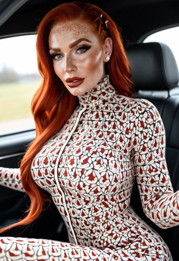 Generate Gorgeous female boss , bimbo , hourglass body , abnormally massive female bodybuilder , gorgeous , close up , full lips , big booty , redheaded , freckles on face and breast , braided design hair , feminine silhouette , too big breast , big booty , sexy thighs abs , silhouette , up close , flexing biceps , beautiful green eyes , legs are iconic and defining physical feature , both visually and in terms of combat ability.wearing an outfit that is a striking blend of elegance , power , and femininity , designed to command attention in any room. The suit is tailored to perfection , hugging the wearer’s curves with precision while emphasizing a structured silhouette. The fabric itself is a refined grey tweed patterned with subtle white grid lines , giving the suit a texture that feels both sophisticated and modern. The blazer features broad blue lapels and gold button accents , adding a luxurious touch that elevates the look beyond typical business attire. The matching high-waisted trousers elongate the frame , further enhancing the poised and commanding effect of the ensemble.The styling choices amplify the boldness of the suit. The inner blouse is a silky , greybutton-down shirt that complements the tweed’s tone while introducing a softer , feminine balance to the sharp tailoring of the jacket. The blouse peeks out neatly from under the blazer , maintaining elegance without drawing focus away from the suit’s commanding cut. Accessories are kept minimal yet intentional: a delicate layered gold necklace and hoop earrings that add glimmers of light and luxury without overpowering the outfit. The choice of voluminous , honey-brown braids cascading down her shoulders frames the face with both confidence and glamour , completing the commanding visual.Altogether , this look communicates a blend of authority and allure. It is business-ready yet fashion-forward , balancing corporate structure with vibrant femininity. The color palette blue , grey and gold avoids being overly delicate , instead embracing the richness of texture , structure , and presence. This is the kind of ensemble that speaks to ambition , sophistication , and personal style—ideal for someone who thrives in positions of influence but insists on expressing her individuality with bold elegance. It’s not just clothing—it’s a statement of power wrapped in grace. In luxury living legs that could crush a watermelon , skirt high boots are a bold and striking statement piece , crafted in glossy black patent leather that gives them a sleek , polished finish. Rising to just below the knee , the boots feature three adjustable buckle straps along the shaft , adding both edge and detail to their design. The towering stiletto heel , paired with a thick platform sole , creates an ultra-dramatic silhouette that elongates the leg and exudes power and confidence. With their combination of shine , height , and structure , these boots perfectly balance fierce femininity with high-fashion allure. She wears a modest , along , turtleneck elegant paisley-patterned dress paired with a cream-colored buttoned cardigan her hands gripping the lapels with confidence. Her expression is playful and teasing , accentuated by glossy red lips and a slight blush. She has a enormous butt and enormous breast , freckles , sitting in beautiful car ,