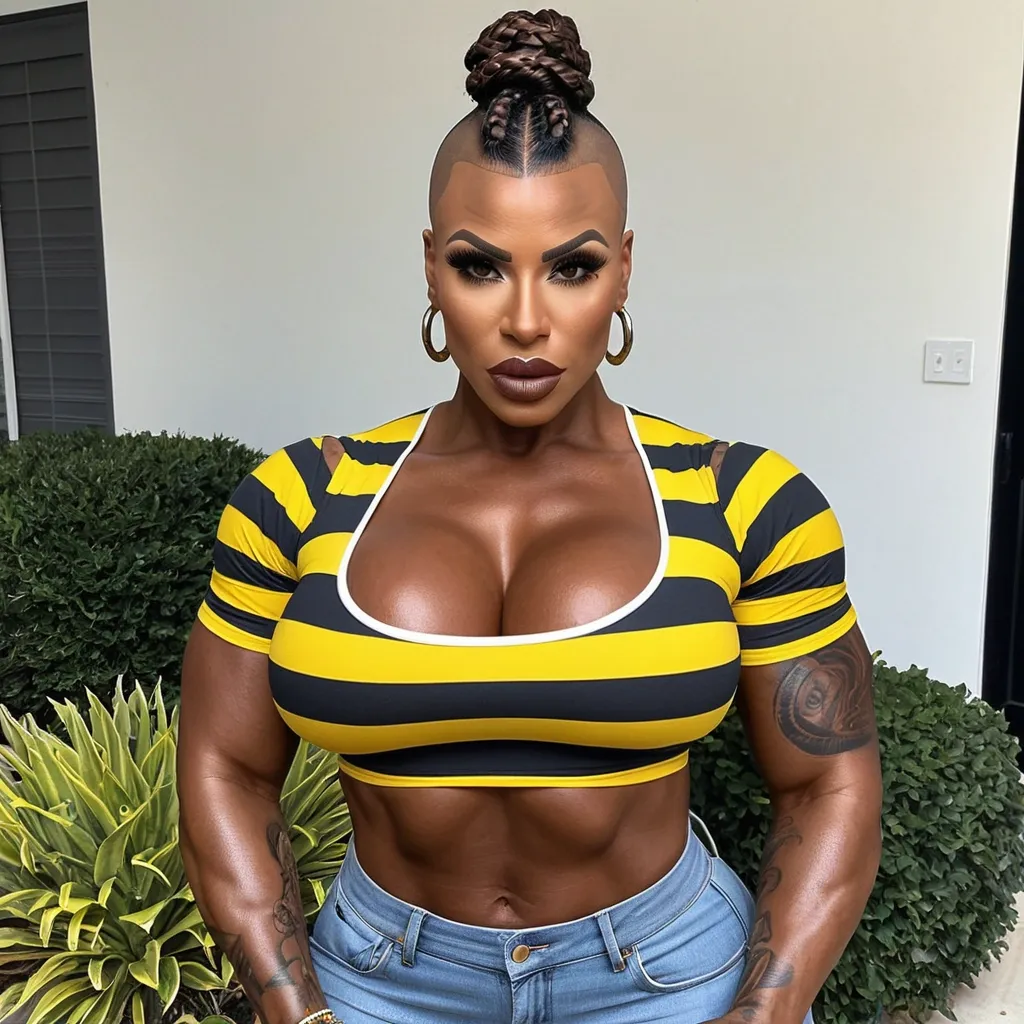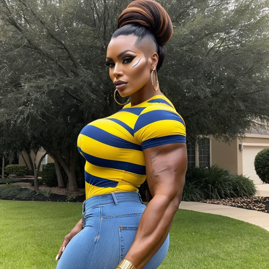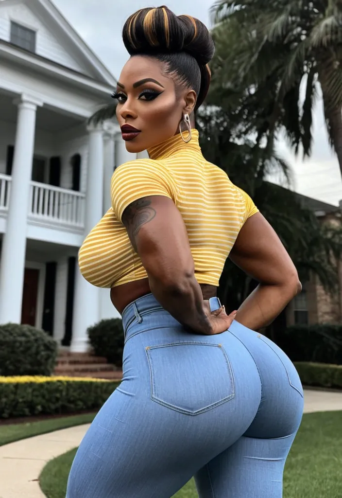 Generate Gorgeous 37 years old , female boss , dark-skinned African-American woman , bimbo , hourglass body , abnormally massive female bodybuilder , gorgeous , close up , full lips , big booty , brown hair , braided styled Mohawk , shaved on the side , bangs , bald design on the side , feminine silhouette , too big breast , big booty , sexy thighs abs , silhouette , up close , flexing biceps , beautiful brown eyes , legs are iconic and defining physical feature , both visually and in terms of combat ability.wearing an outfit that is a striking blend of elegance , power , and femininity , designed to command attention in any room. The suit is tailored to perfection , hugging the wearer’s curves with precision while emphasizing a structured silhouette. The fabric itself is a refined grey tweed patterned with subtle white grid lines , giving the suit a texture that feels both sophisticated and modern. The blazer features broad blue lapels and gold button accents , adding a luxurious touch that elevates the look beyond typical business attire. The matching high-waisted trousers elongate the frame , further enhancing the poised and commanding effect of the ensemble.The styling choices amplify the boldness of the suit. The inner blouse is a silky , greybutton-down shirt that complements the tweed’s tone while introducing a softer , feminine balance to the sharp tailoring of the jacket. The blouse peeks out neatly from under the blazer , maintaining elegance without drawing focus away from the suit’s commanding cut. Accessories are kept minimal yet intentional: a delicate layered gold necklace and hoop earrings that add glimmers of light and luxury without overpowering the outfit. The choice of voluminous , honey-brown braids cascading down her shoulders frames the face with both confidence and glamour , completing the commanding visual.Altogether , this look communicates a blend of authority and allure. It is business-ready yet fashion-forward , balancing corporate structure with vibrant femininity. The color palette blue , grey and gold avoids being overly delicate , instead embracing the richness of texture , structure , and presence. This is the kind of ensemble that speaks to ambition , sophistication , and personal style—ideal for someone who thrives in positions of influence but insists on expressing her individuality with bold elegance. It’s not just clothing—it’s a statement of power wrapped in grace. In luxury living legs that could crush a watermelon , skirt high boots are a bold and striking statement piece , crafted in glossy black patent leather that gives them a sleek , polished finish. Rising to just below the knee , the boots feature three adjustable buckle straps along the shaft , adding both edge and detail to their design. The towering stiletto heel , paired with a thick platform sole , creates an ultra-dramatic silhouette that elongates the leg and exudes power and confidence. With their combination of shine , height , and structure , these boots perfectly balance fierce femininity with high-fashion allure. High cheekbones , prominent jawline , gorgeous big brown eyes , freckles , enormous breast , grey denim pants , yellow and blue horizontal striped v neck t- shirt , skirt , front yard gorgeous brown eyes , ,