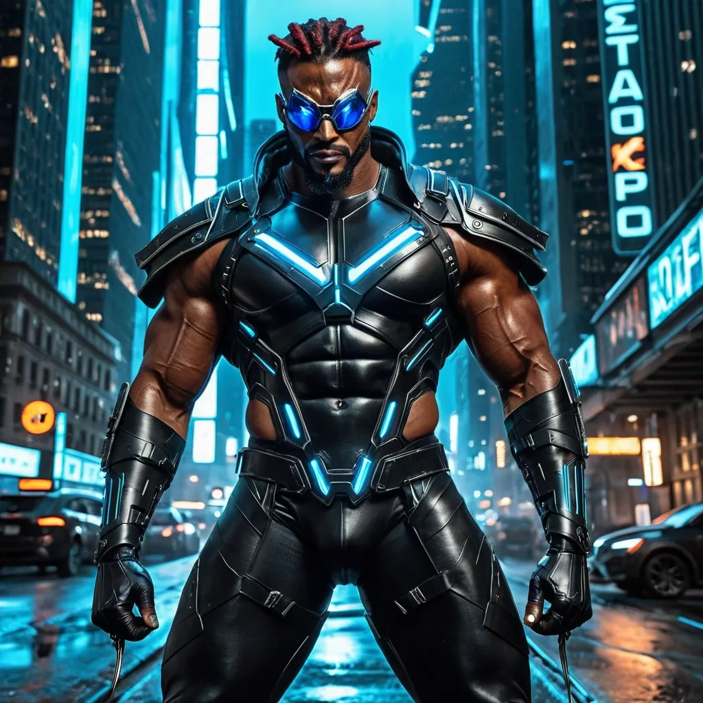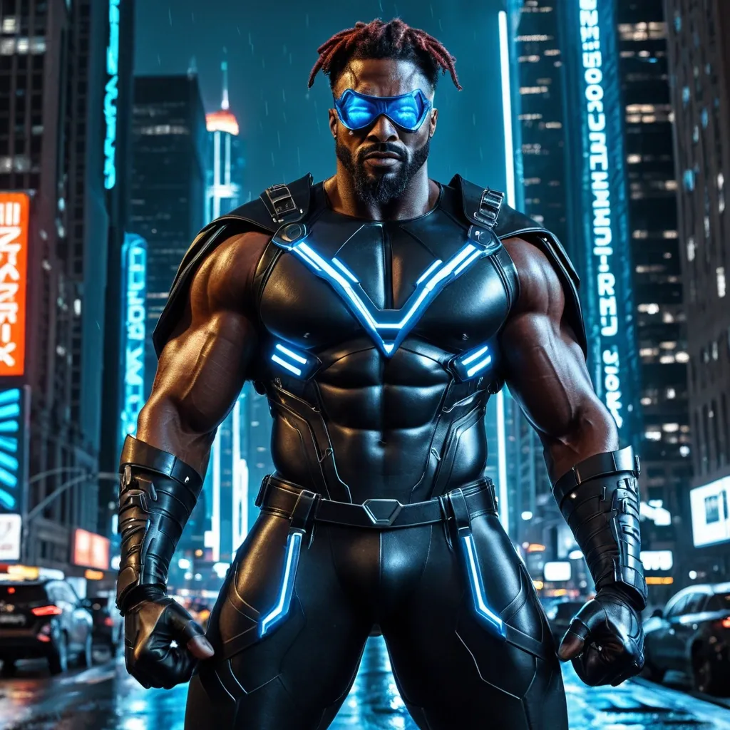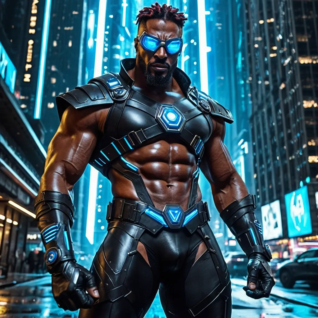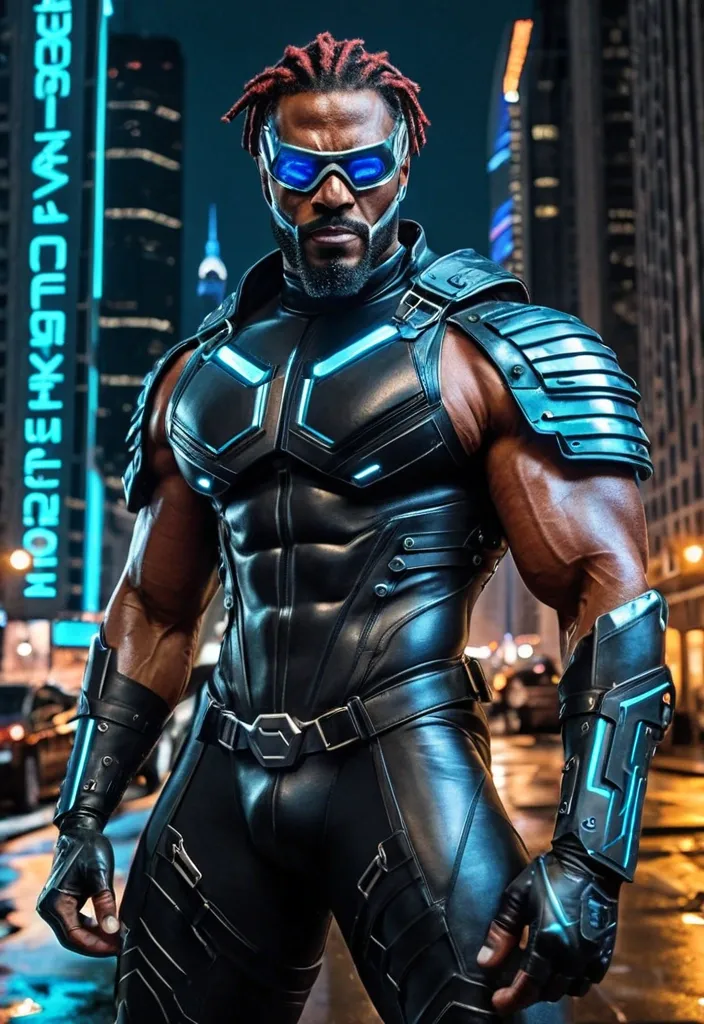 Light-skinned African-American/ hispanic superhero abnormally massive male bodybuilder , close up , full lips , big booty , square eye glasses , reddish brown hair , dreadlocks in poinytail , big , muscular man , brown strikingly intense and alluring eyes , up close , flexing biceps , gorgeous dark green eyes , well trimmed goatee , legs are iconic and defining physical feature , both visually and in terms of combat ability.wearing an outfit that is a striking blend of elegance , power , and femininity , designed to command attention in any room. The suit is tailored to perfection , hugging the wearer’s curves with precision while emphasizing a structured silhouette. The fabric itself is a refined grey tweed patterned with subtle white grid lines , giving the suit a texture that feels both sophisticated and modern. The blazer features broad blue lapels and gold button accents , adding a luxurious touch that elevates the look beyond typical business attire. The matching high-waisted trousers elongate the frame , further enhancing the poised and commanding effect of the ensemble.The styling choices amplify the boldness of the suit. The inner shirt is a silky , greybutton-down shirt that complements the tweed’s tone while introducing a masculine balance to the sharp tailoring of the jacket. The shirt peeks out neatly from under the blazer , maintaining elegance without drawing focus away from the suit’s commanding cut. Accessories are kept minimal yet intentional: a delicate layered gold necklace ad alpha leader of light and luxury without overpowering the outfit completing the commanding visual.Altogether , this look communicates a blend of authority and allure. It is business-ready yet fashion-forward , balancing corporate structure with vibrant femininity. The color palette blue , grey and gold avoids being overly delicate , instead embracing the richness of texture , structure , and presence. This is the kind of ensemble that speaks to ambition , sophistication , and personal style—ideal for someone who thrives in positions of influence but insists on expressing her individuality with bold elegance. It’s not just clothing—it’s a statement of power wrapped in grace. In luxury living legs that could crush a watermelon , skirt high boots are a bold and striking statement piece , crafted in glossy black patent leather that gives them a sleek , polished finish. Rising to just below the knee , the boots feature three adjustable buckle straps along the shaft , adding both edge and detail to their design. The towering stiletto heel , paired with a thick platform sole , creates an ultra-dramatic silhouette that elongates the leg and exudes power and confidence. With their combination of shine , height , and structure , these boots perfectly balance fierce femininity with high-fashion allure , Gorgeous smile , white t-shirt , grey vest , grey slacks , in luxurious apartment his striking African-American male superhero stands as a commanding figure in a neon-drenched cyberpunk cityscape at night , rain-slicked streets reflecting glowing blue and teal lights from towering skyscrapers and holographic signs in the blurred background. He wears a sleek , high-tech visor mask—futuristic silver-framed goggles with glowing blue lenses that wrap around his eyes , giving him an intense , cybernetic gaze while concealing his identity. His bodysuit is a form-fitting , hardened black leather ensemble with metallic blue accents , featuring reinforced armored plating on the shoulders and chest for a tactical , battle-ready look , complemented by blue straps and buckles crossing his torso. Over it , he dons a dramatic , high-collared black leather trench coat that flares slightly , adding a sense of brooding authority and movement. His hands are clad in sturdy black leather gloves with metallic reinforcements , ready for combat. Slung across his back or held at the ready is a massive , double-headed battle ax with a glowing blue edge , evoking raw power and futuristic menace. At the bottom of the frame , bold metallic text reads “EPOCH” in large letters above “SON OF TOMORROW , ” branding him as a hero destined to shape the future. ,