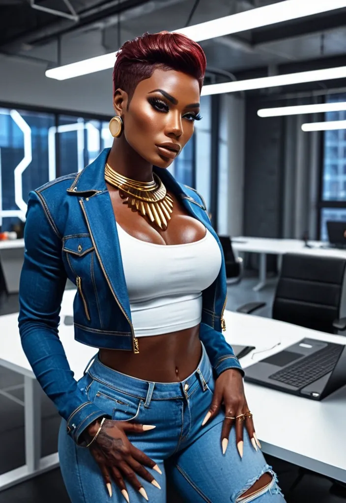 Generate Gorgeous 24 years old , female boss , dark-skinned African-American woman , pointy face , bimbo , hourglass body , abnormally massive female bodybuilder , gorgeous , close up , full lips , big booty , short stylish pixie hair cut futuristic mini afro , feminine silhouette , too big breast , big booty , sexy thighs abs , silhouette , up close , flexing biceps , beautiful brown eyes , legs are iconic and defining physical feature , both visually and in terms of combat ability.wearing an outfit that is a striking blend of elegance , power , and femininity , designed to command attention in any room. The suit is tailored to perfection , hugging the wearer’s curves with precision while emphasizing a structured silhouette. The fabric itself is a refined grey tweed patterned with subtle white grid lines , giving the suit a texture that feels both sophisticated and modern. The blazer features broad blue lapels and gold button accents , adding a luxurious touch that elevates the look beyond typical business attire. The matching high-waisted trousers elongate the frame , further enhancing the poised and commanding effect of the ensemble.The styling choices amplify the boldness of the suit. The inner blouse is a silky , greybutton-down shirt that complements the tweed’s tone while introducing a softer , feminine balance to the sharp tailoring of the jacket. The blouse peeks out neatly from under the blazer , maintaining elegance without drawing focus away from the suit’s commanding cut. Accessories are kept minimal yet intentional: a delicate layered gold necklace and hoop earrings that add glimmers of light and luxury without overpowering the outfit. The choice of voluminous , honey-brown braids cascading down her shoulders frames the face with both confidence and glamour , completing the commanding visual.Altogether , this look communicates a blend of authority and allure. It is business-ready yet fashion-forward , balancing corporate structure with vibrant femininity. The color palette blue , grey and gold avoids being overly delicate , instead embracing the richness of texture , structure , and presence. This is the kind of ensemble that speaks to ambition , sophistication , and personal style—ideal for someone who thrives in positions of influence but insists on expressing her individuality with bold elegance. It’s not just clothing—it’s a statement of power wrapped in grace. In luxury living legs that could crush a watermelon , skirt high boots are a bold and striking statement piece , crafted in glossy black patent leather that gives them a sleek , polished finish. Rising to just below the knee , the boots feature three adjustable buckle straps along the shaft , adding both edge and detail to their design. The towering stiletto heel , paired with a thick platform sole , creates an ultra-dramatic silhouette that elongates the leg and exudes power and confidence. With their combination of shine , height , and structure , these boots perfectly balance fierce femininity with high-fashion allure. High cheekbones , prominent jawline , gorgeous big brown light hazel honey , dark red hair , enormous breast , futuristic blue denim jacket white t-shirt , gold futuristic necklace , denim pants in futuristic office ,