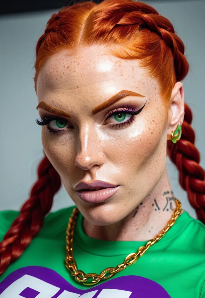 Generate Gorgeous female boss , bimbo , high cheekbones , sharp bone structure , prominent jawline face hourglass body , abnormally massive female bodybuilder , gorgeous , close up , full lips , big booty , redheaded , freckles on face and breast , braided design hair , feminine silhouette , too big breast , big booty , sexy thighs abs , silhouette , up close , flexing biceps , beautiful green eyes , legs are iconic and defining physical feature , both visually and in terms of combat ability.wearing an outfit that is a striking blend of elegance , power , and femininity , designed to command attention in any room. The suit is tailored to perfection , hugging the wearer’s curves with precision while emphasizing a structured silhouette. The fabric itself is a refined grey tweed patterned with subtle white grid lines , giving the suit a texture that feels both sophisticated and modern. The blazer features broad blue lapels and gold button accents , adding a luxurious touch that elevates the look beyond typical business attire. The matching high-waisted trousers elongate the frame , further enhancing the poised and commanding effect of the ensemble.The styling choices amplify the boldness of the suit. The inner blouse is a silky , greybutton-down shirt that complements the tweed’s tone while introducing a softer , feminine balance to the sharp tailoring of the jacket. The blouse peeks out neatly from under the blazer , maintaining elegance without drawing focus away from the suit’s commanding cut. Accessories are kept minimal yet intentional: a delicate layered gold necklace and hoop earrings that add glimmers of light and luxury without overpowering the outfit. The choice of voluminous , honey-brown braids cascading down her shoulders frames the face with both confidence and glamour , completing the commanding visual.Altogether , this look communicates a blend of authority and allure. It is business-ready yet fashion-forward , balancing corporate structure with vibrant femininity. The color palette blue , grey and gold avoids being overly delicate , instead embracing the richness of texture , structure , and presence. This is the kind of ensemble that speaks to ambition , sophistication , and personal style—ideal for someone who thrives in positions of influence but insists on expressing her individuality with bold elegance. It’s not just clothing—it’s a statement of power wrapped in grace. In luxury living legs that could crush a watermelon , skirt high boots are a bold and striking statement piece , crafted in glossy black patent leather that gives them a sleek , polished finish. Rising to just below the knee , the boots feature three adjustable buckle straps along the shaft , adding both edge and detail to their design. The towering stiletto heel , paired with a thick platform sole , creates an ultra-dramatic silhouette that elongates the leg and exudes power and confidence. With their combination of shine , height , and structure , these boots perfectly balance fierce femininity with high-fashion allure. Big gorgeous green eyes , freckles , purple swede t-shirt , gold futuristic necklace ,