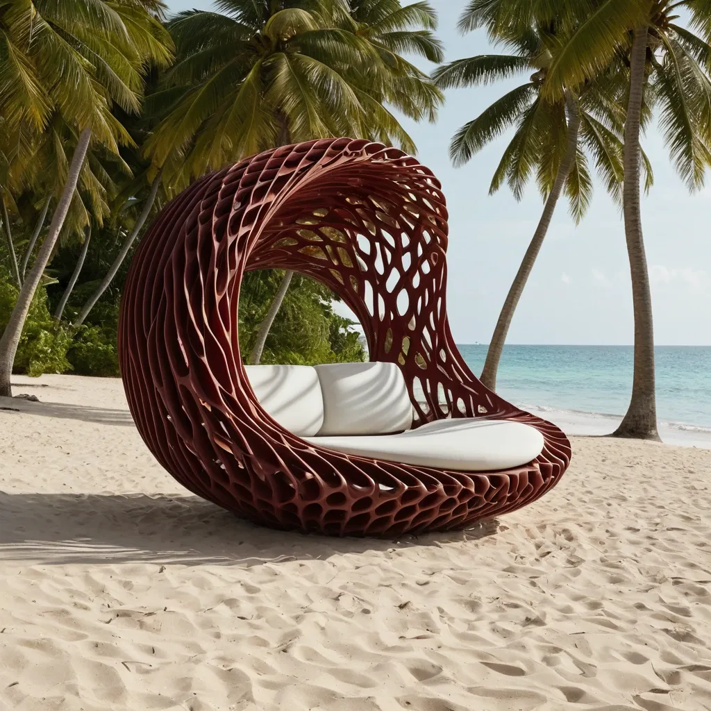 A futuristic , sculptural seating unit is designed for a beach area , echoing the forms of crab structures in its load-bearing elements. The unit features curved , smooth surfaces and an open framework that weaves together to create a light , airy appearance. Inspired by nature , the organic design is crafted from sustainable materials with a minimalist approach to minimize material usage , while ensuring structural integrity. Placed near a tranquil sea , the seating unit's earthy maroon color blends harmoniously with the surroundings , as the gentle rustling of leaves from nearby coconut trees and the soft collisions of beach-goers create a soothing ambiance. The large glass top allows lush greenery to ketchup against its underside , mirroring the dappled sea nearby , thus blurring the lines between nature and structure. ,