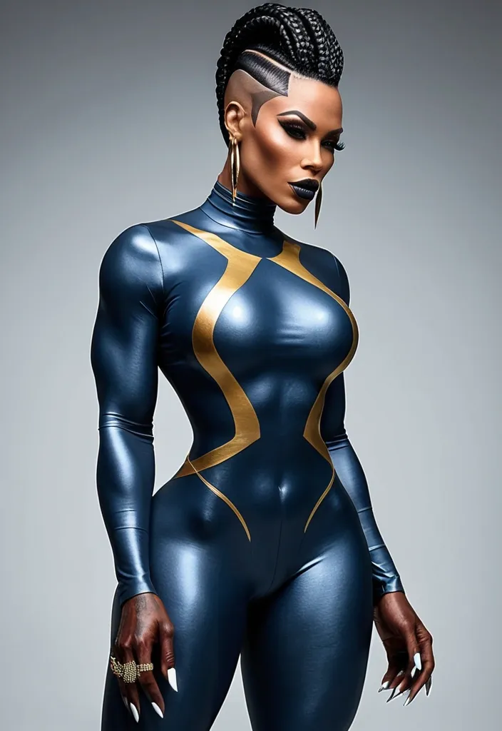 Generate Gorgeous female boss , bimbo , hourglass body , dark-skinned African-American , pointy face , abnormally massive female bodybuilder , gorgeous , close up , full lips , big booty , black hair , braided design mohawk , bald on the side , feminine silhouette , too big breast , big booty , sexy thighs abs , silhouette , up close , flexing biceps , gorgeous hazel eyes , legs are iconic and defining physical feature , both visually and in terms of combat ability.wearing an outfit that is a striking blend of elegance , power , and femininity , designed to command attention in any room. The suit is tailored to perfection , hugging the wearer’s curves with precision while emphasizing a structured silhouette. The fabric itself is a refined grey tweed patterned with subtle white grid lines , giving the suit a texture that feels both sophisticated and modern. The blazer features broad blue lapels and gold button accents , adding a luxurious touch that elevates the look beyond typical business attire. The matching high-waisted trousers elongate the frame , further enhancing the poised and commanding effect of the ensemble.The styling choices amplify the boldness of the suit. The inner blouse is a silky , greybutton-down shirt that complements the tweed’s tone while introducing a softer , feminine balance to the sharp tailoring of the jacket. The blouse peeks out neatly from under the blazer , maintaining elegance without drawing focus away from the suit’s commanding cut. Accessories are kept minimal yet intentional: a delicate layered gold necklace and hoop earrings that add glimmers of light and luxury without overpowering the outfit. The choice of voluminous , honey-brown braids cascading down her shoulders frames the face with both confidence and glamour , completing the commanding visual.Altogether , this look communicates a blend of authority and allure. It is business-ready yet fashion-forward , balancing corporate structure with vibrant femininity. The color palette blue , grey and gold avoids being overly delicate , instead embracing the richness of texture , structure , and presence. This is the kind of ensemble that speaks to ambition , sophistication , and personal style—ideal for someone who thrives in positions of influence but insists on expressing her individuality with bold elegance. It’s not just clothing—it’s a statement of power wrapped in grace. Stacked hourglass silhouette , t-shirt , modest t-shirt ,