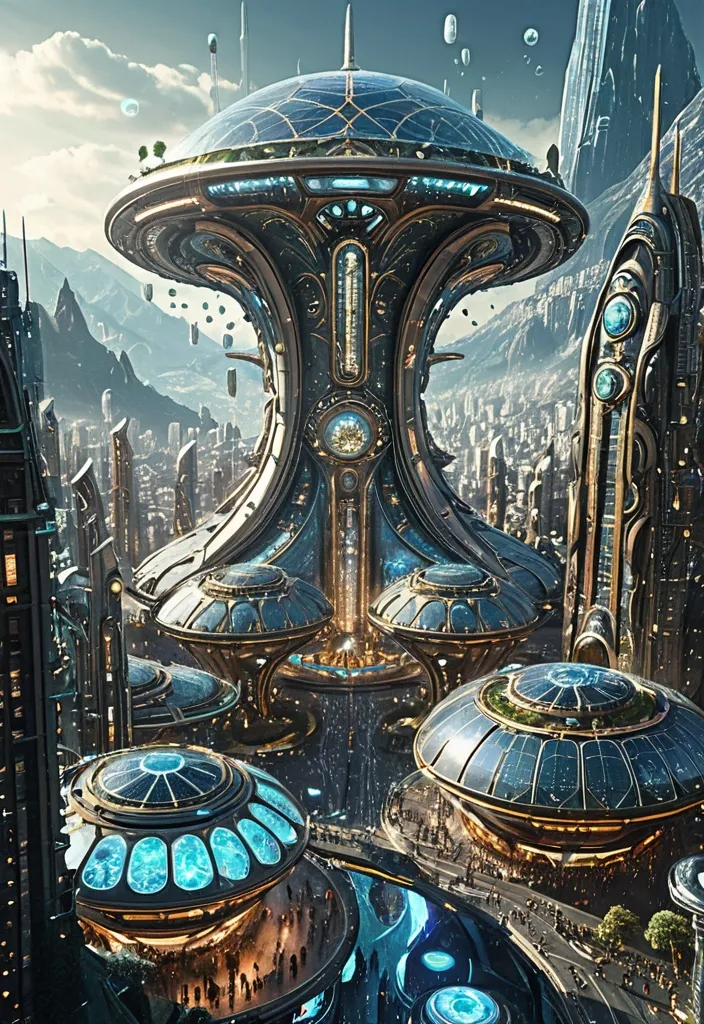 A urban scene in 2059: Futuristic Solarpunk city with Skylines , illuminated spiral skyscrapers and a large solar panel dome at the top , in a streets are filled with people in advanced , tech-inspired clothing surrounded by mountains covered with sparkling mucilage droplets , ornate organic looking art nouveau inspired structures with solar-panel glass , nature and technology in harmony. ,