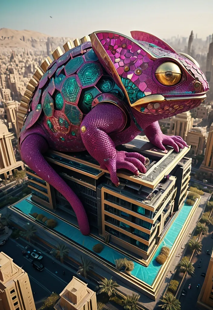 A colossal , 3d architectural rendering of a futuristic and sustainable real estate project in a modern Egyptian city built entirely on the back of a giant chameleon perched on a flowering branch , its body positioned diagonally across the frame from upper left to lower right. The chameleon's scales are rendered in extraordinary detail , displaying a vivid mosaic of deep magenta , coral pink , teal , turquoise , and gold tones arranged in intricate overlapping patterns across its body , casque , limbs , and curling tail. Shot in realistic live-action cinematography style. High dynamic range lighting , cinematic color grading , subtle film grain. Natural optical depth of field , realistic lens blur , slight handheld camera micro-movement. 50mm cinematic lens , f/4 aperture , physically accurate lighting , volumetric light diffusion. 8K level visual fidelity , highly detailed environment , believable scale and realistic crowd simulation. The scene feels like a frame from a large-budget live-action science-fiction space movie. ,