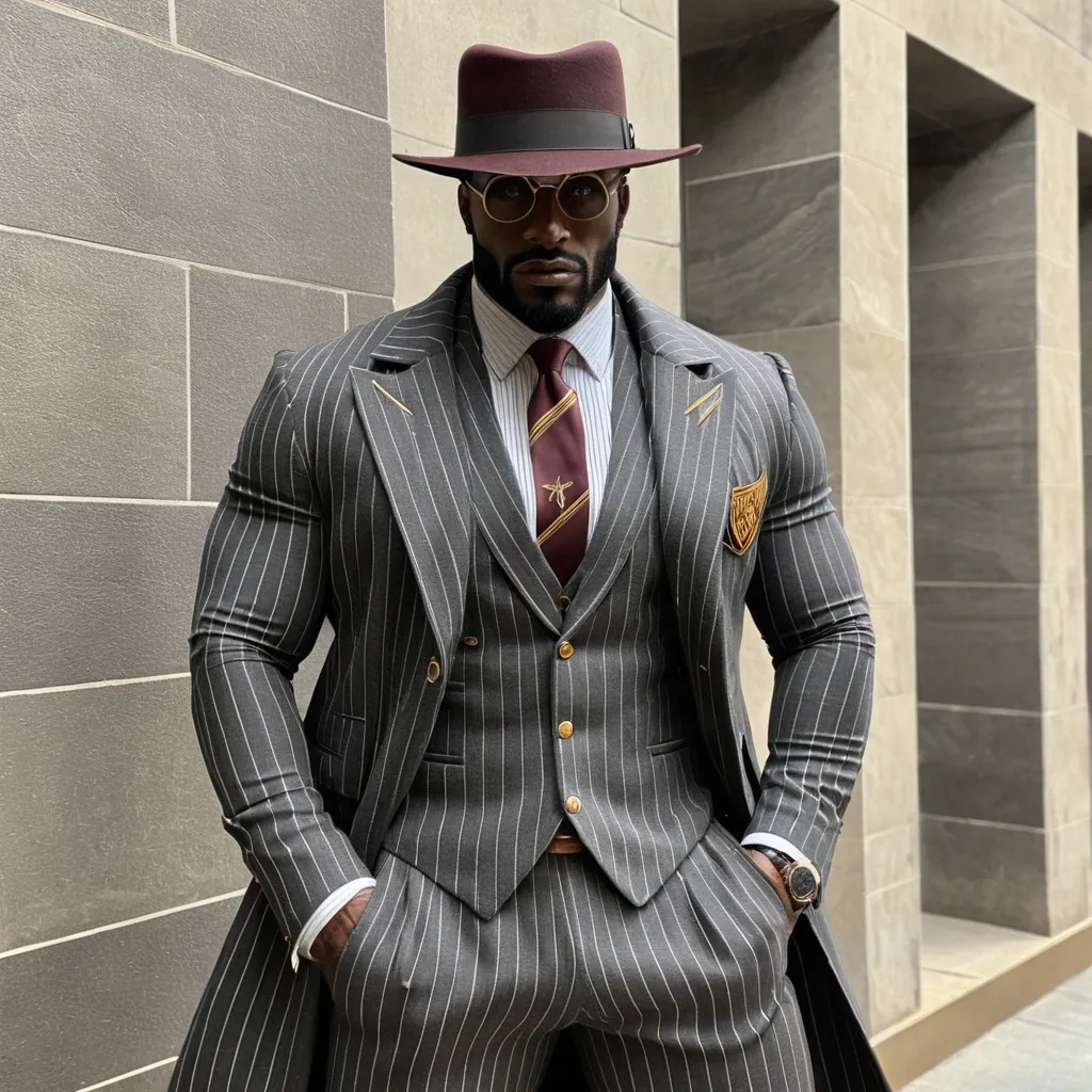 Generate ruggedly handsome 1940s superhero dark-skinned African-American man abnormally massive male bodybuilderclose up , full lips , big booty , black trimmed coarse hair , big , muscular man , brown strikingly intense and alluring eyes , up close , flexing biceps , beautiful brown eyes , legs are iconic and defining physical feature , both visually and in terms of combat ability.wearing an outfit that is a striking blend of elegance , power , and femininity , designed to command attention in any room. The suit is tailored to perfection , hugging the wearer’s curves with precision while emphasizing a structured silhouette. The fabric itself is a refined grey tweed patterned with subtle white grid lines , giving the suit a texture that feels both sophisticated and modern. The blazer features broad blue lapels and gold button accents , adding a luxurious touch that elevates the look beyond typical business attire. The matching high-waisted trousers elongate the frame , further enhancing the poised and commanding effect of the ensemble.The styling choices amplify the boldness of the suit. The inner shirt is a silky , greybutton-down shirt that complements the tweed’s tone while introducing a masculine balance to the sharp tailoring of the jacket. The shirt peeks out neatly from under the blazer , maintaining elegance without drawing focus away from the suit’s commanding cut. Accessories are kept minimal yet intentional: a delicate layered gold necklace ad alpha leader of light and luxury without overpowering the outfit completing the commanding visual.Altogether , this look communicates a blend of authority and allure. It is business-ready yet fashion-forward , balancing corporate structure with vibrant femininity. The color palette blue , grey and gold avoids being overly delicate , instead embracing the richness of texture , structure , and presence. This is the kind of ensemble that speaks to ambition , sophistication , and personal style—ideal for someone who thrives in positions of influence but insists on expressing her individuality with bold elegance. It’s not just clothing—it’s a statement of power wrapped in grace. In luxury living legs that could crush a watermelon , skirt high boots are a bold and striking statement piece , crafted in glossy black patent leather that gives them a sleek , polished finish. Rising to just below the knee , the boots feature three adjustable buckle straps along the shaft , adding both edge and detail to their design. The towering stiletto heel , paired with a thick platform sole , creates an ultra-dramatic silhouette that elongates the leg and exudes power and confidence. With their combination of shine , height , and structure , these boots perfectly balance fierce femininity with high-fashion allure , He’s wearing a fedora a long stylish stetson , a charcoal grey suit jacket with whie pinstripes , and burgundy button up shirt and gold tie , snd charcoal grey and white pinstriped trench coat , and half mask , exposing full lipd and gorgeous brown eyes , and golden scales of just emblem on right chest , ,