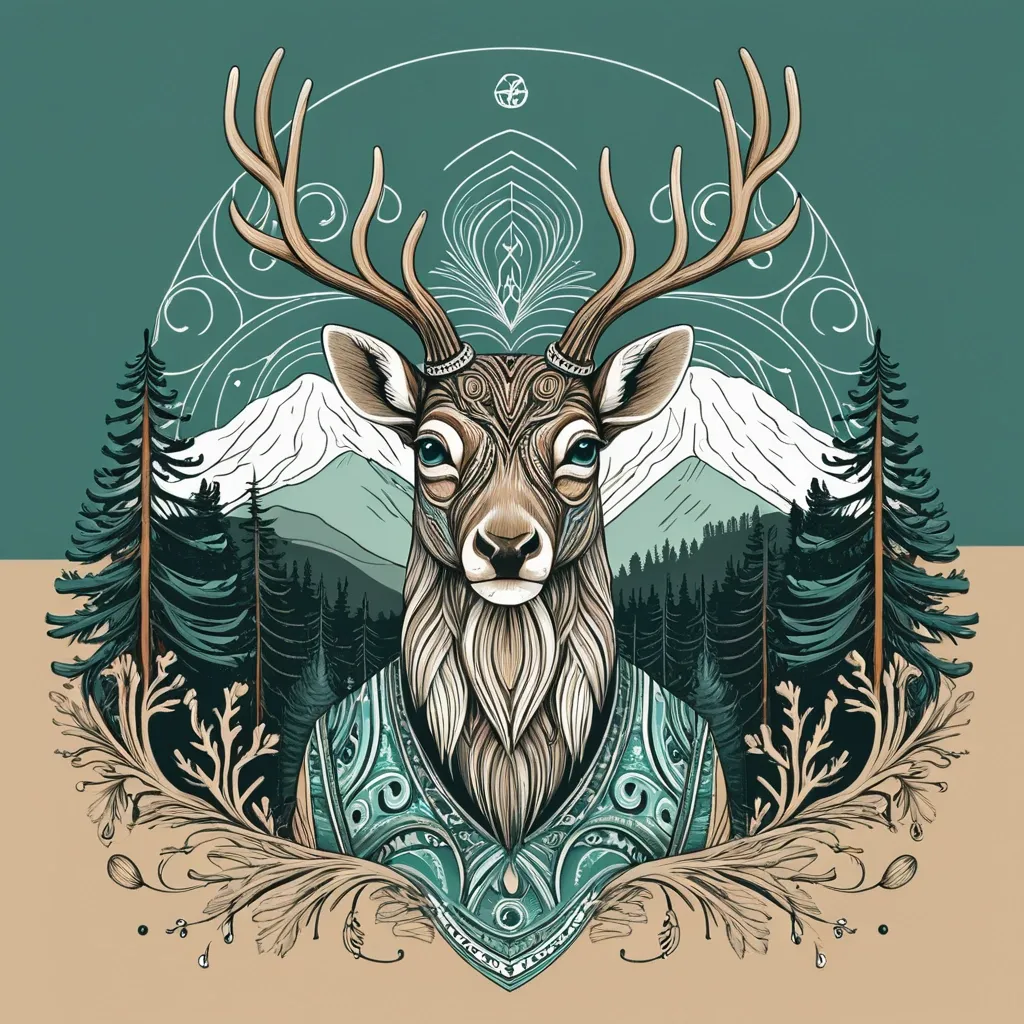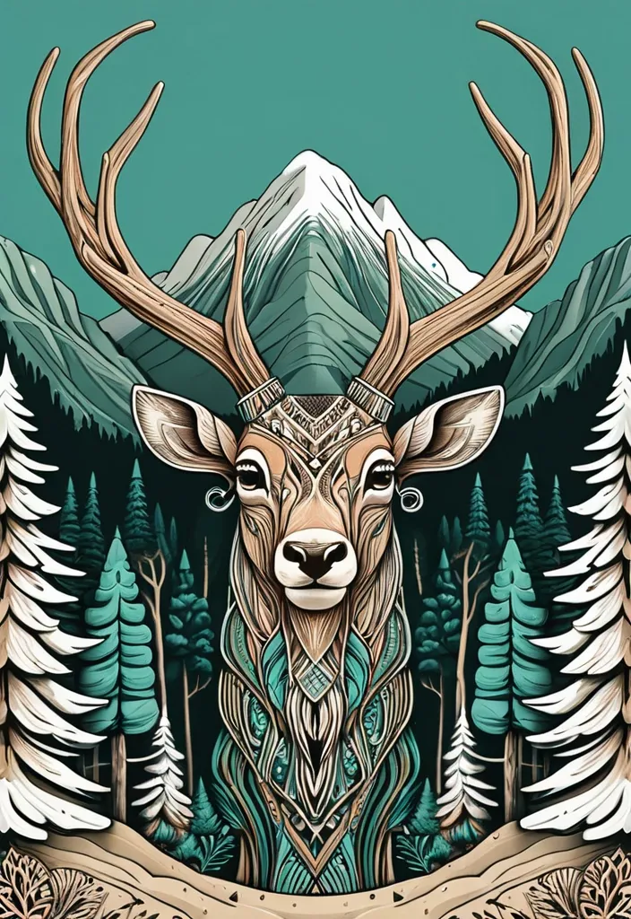modern graphic T-shirt art. Use the general vibe and composition style of bold linework , decorative detailing , and dynamic shapes similar to the attached mammoth design , but lighter and smoother. In the center , depict a majestic Crimean deer with expressive eyes and elegant antlers. Surround the deer with elements of Crimean nature: pine trees , rocky mountains , coastal wind lines , and organic ornamental patterns. Use 2–3 additional accent colors (soft teal , warm sand , muted forest green) while keeping the overall illustration clean and harmonious. Add gentle shading , smooth contours , and decorative strokes to maintain a stylish yet softer look. The design should feel modern , eye-catching , and suitable for a T-shirt print." ,