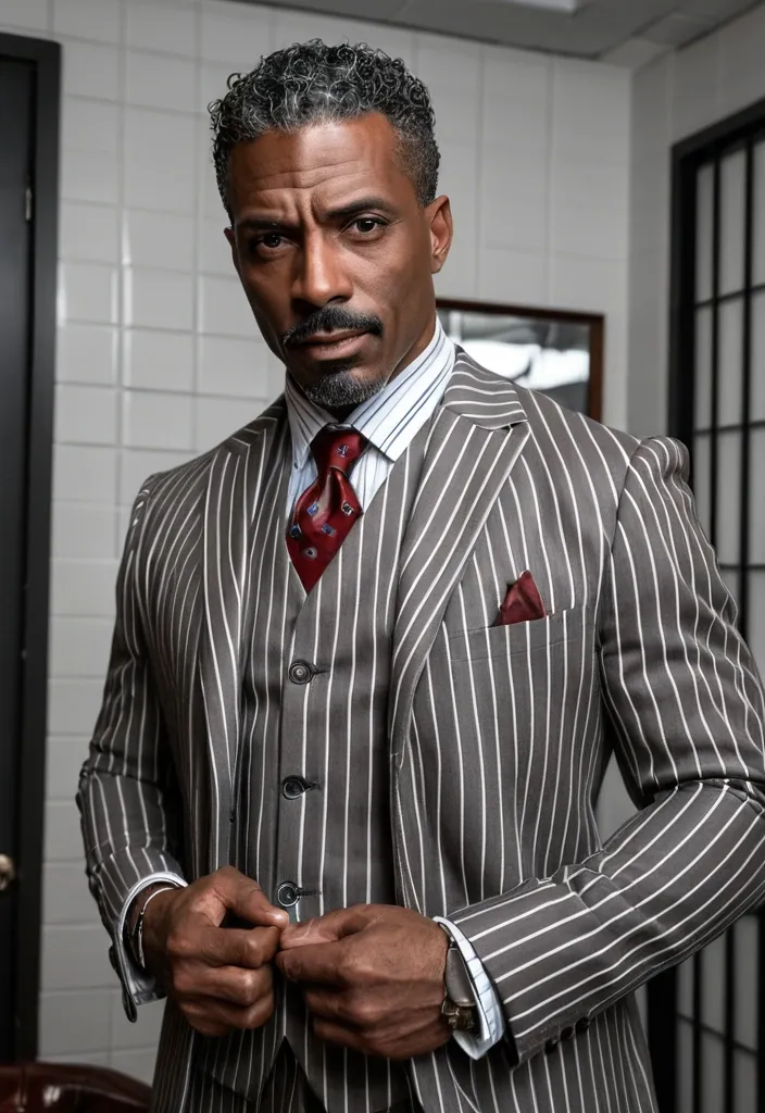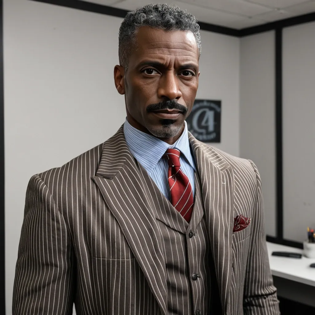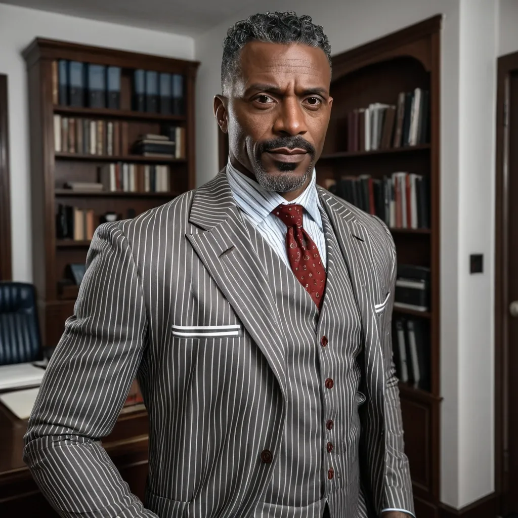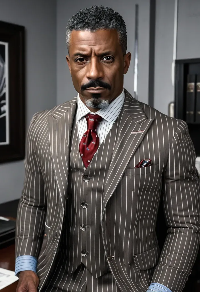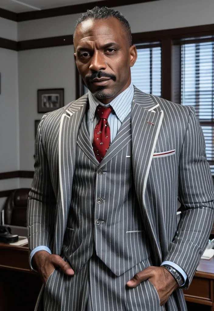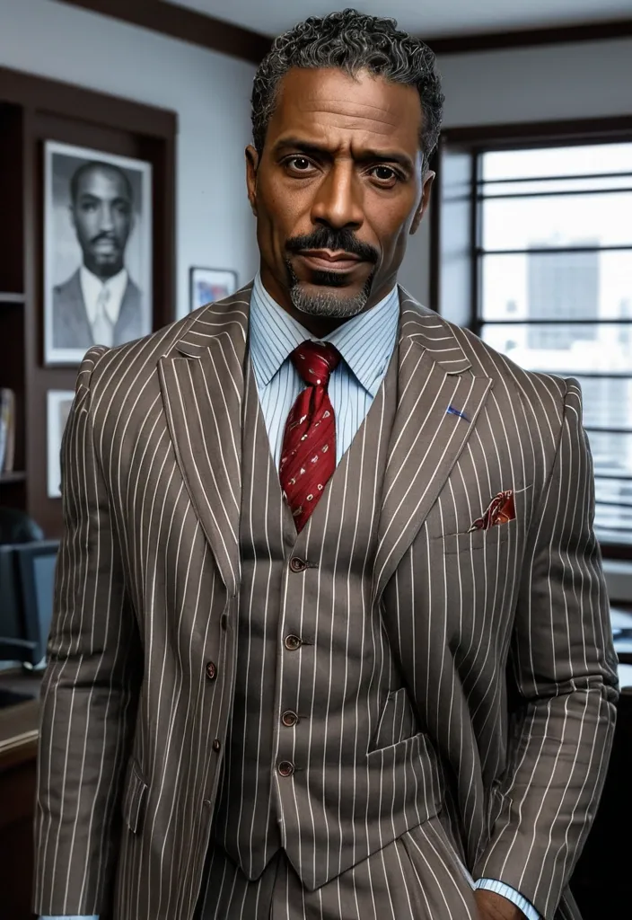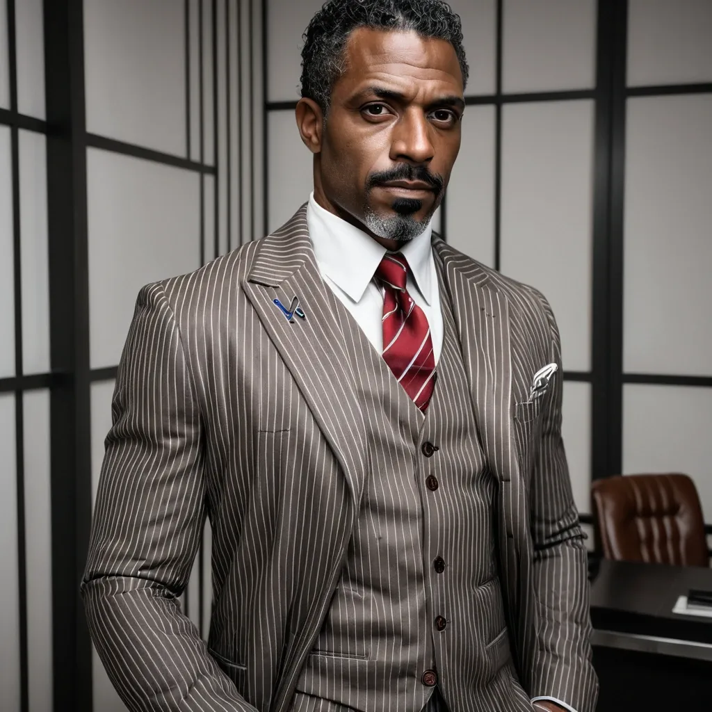 Handsome debonair , 46 year-old African-American manbig brown eyes , brown skinned , big brown eyes , clean , shaving the haircut , mustache at the curls at the end tall lean prestigious stoic 1940/futuristic/noir Office a grey blue whit white pinstriped jacket , brown vest , red tie three-piece suit , red handkerchief jacket pocket ,