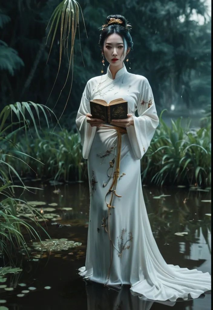 Photorealistic young woman inspired by Liu Yifei , long twisted hair bun into loose messy pigtails , strands falling across her face with various tiny decorations , slightly disheveled with form-fitting white silk Ao Dai , standing on a pond's edge lush with vegetations , her hand holding an ancient book glittering from its golden edge. Cinematic film still , shot on v-raptor XL , 35mm film , film grain , vignette , post-processed color grading , cinematic lighting , live-action , hyperrealistic , atmospheric , best quality , a masterpiece , epic , stunning , dramatic. , ,