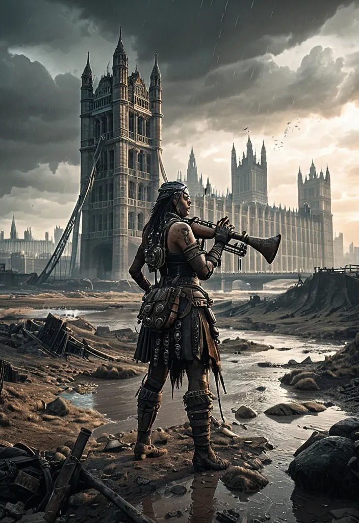 A tribal girl from the Fallout universe plays bagpipes standing on a sparse , dry riverbed. She looks up at the towering ruins of London under a stormy sky. Ultra-detailed , wide-angle shot. The scene is rendered in a gritty , post-apocalyptic concept art style , with a desaturated color palette punctuated by the warm glow of the bagpipe's drone. Inspired by the atmospheric realism of Simon Stålenhag and the detailed environmental design of Sparth. Dramatic , cinematic lighting accentuates the desolate landscape. ,